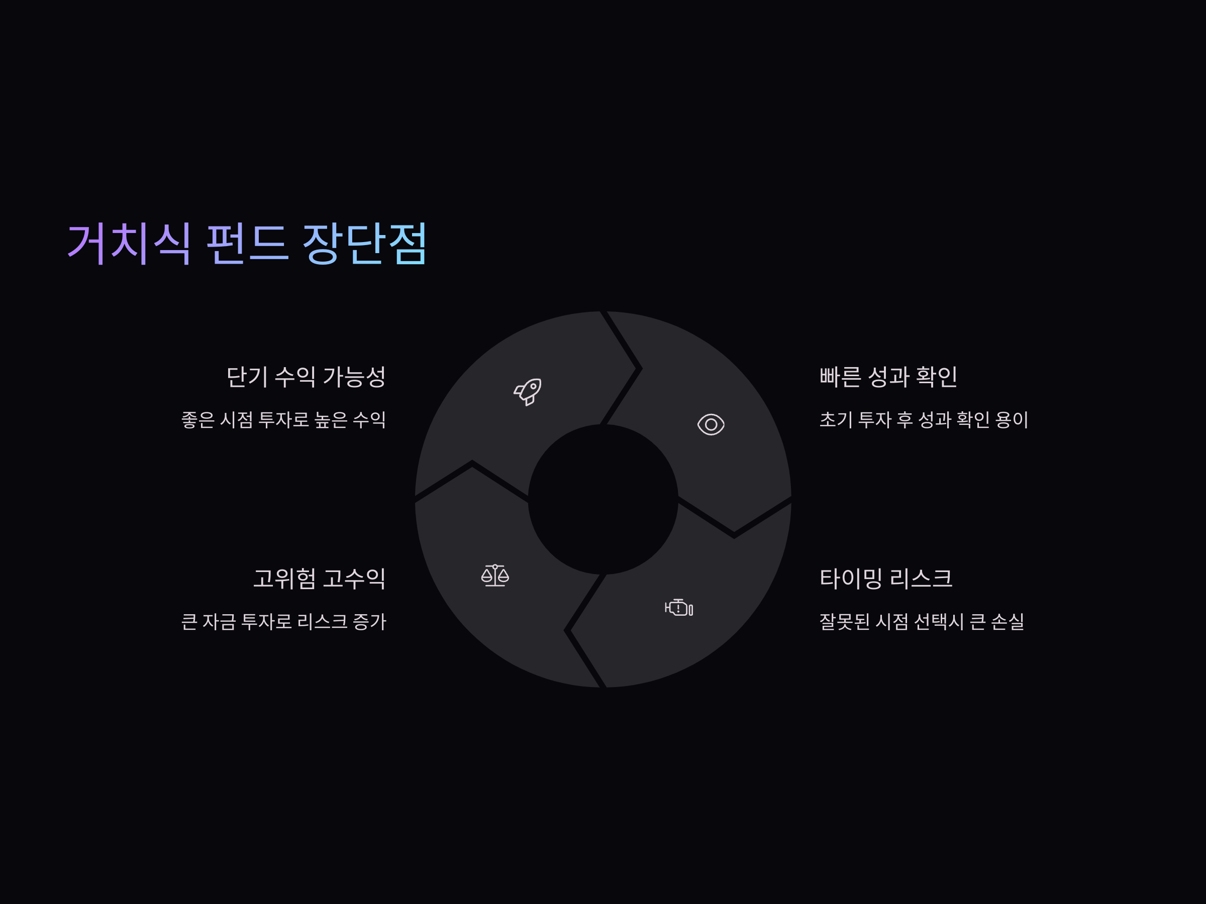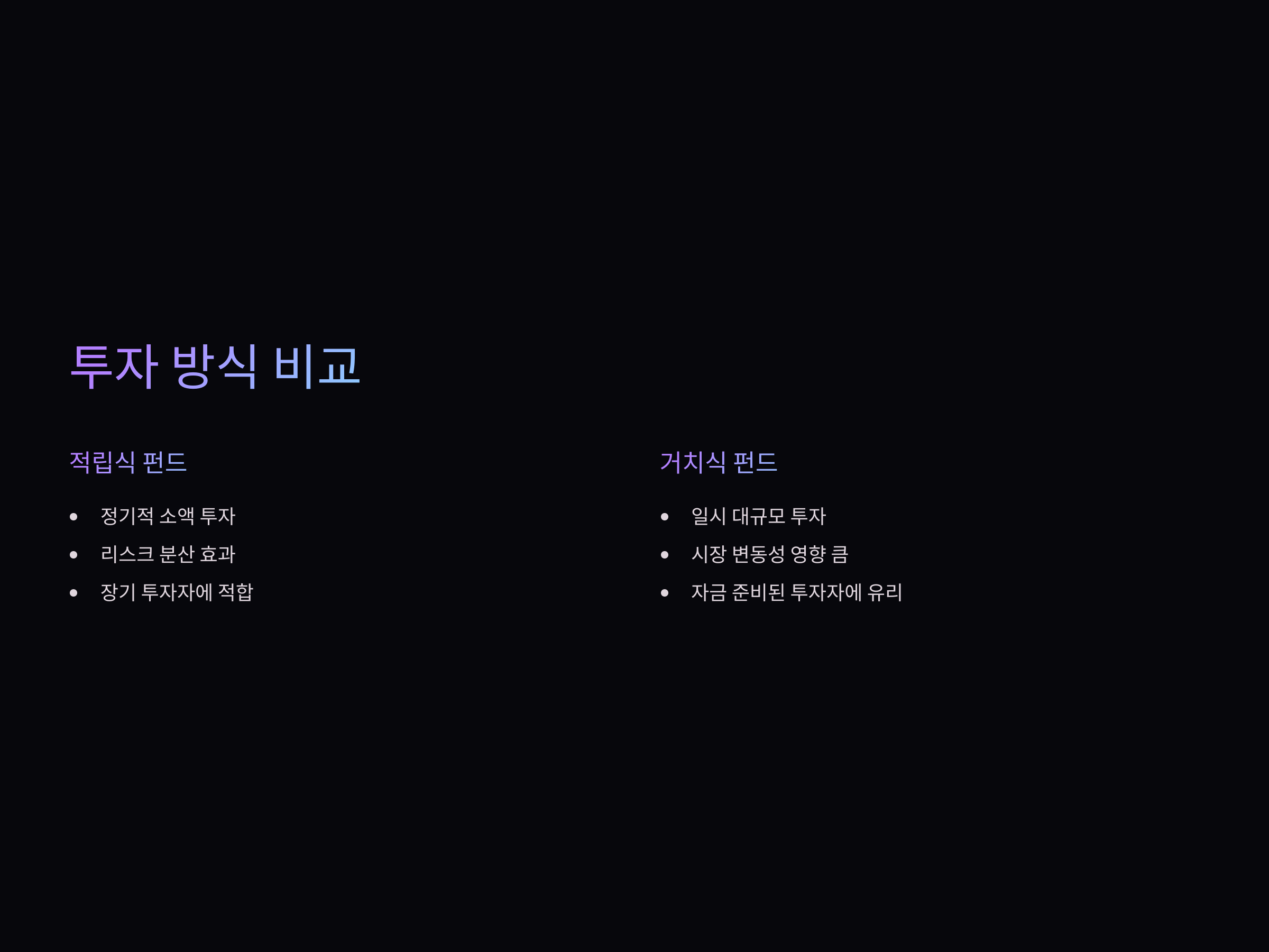 - 거치식 펀드: 투자 시점에 따라 시장 변동성의 영향을 크게 받을 수 있음.