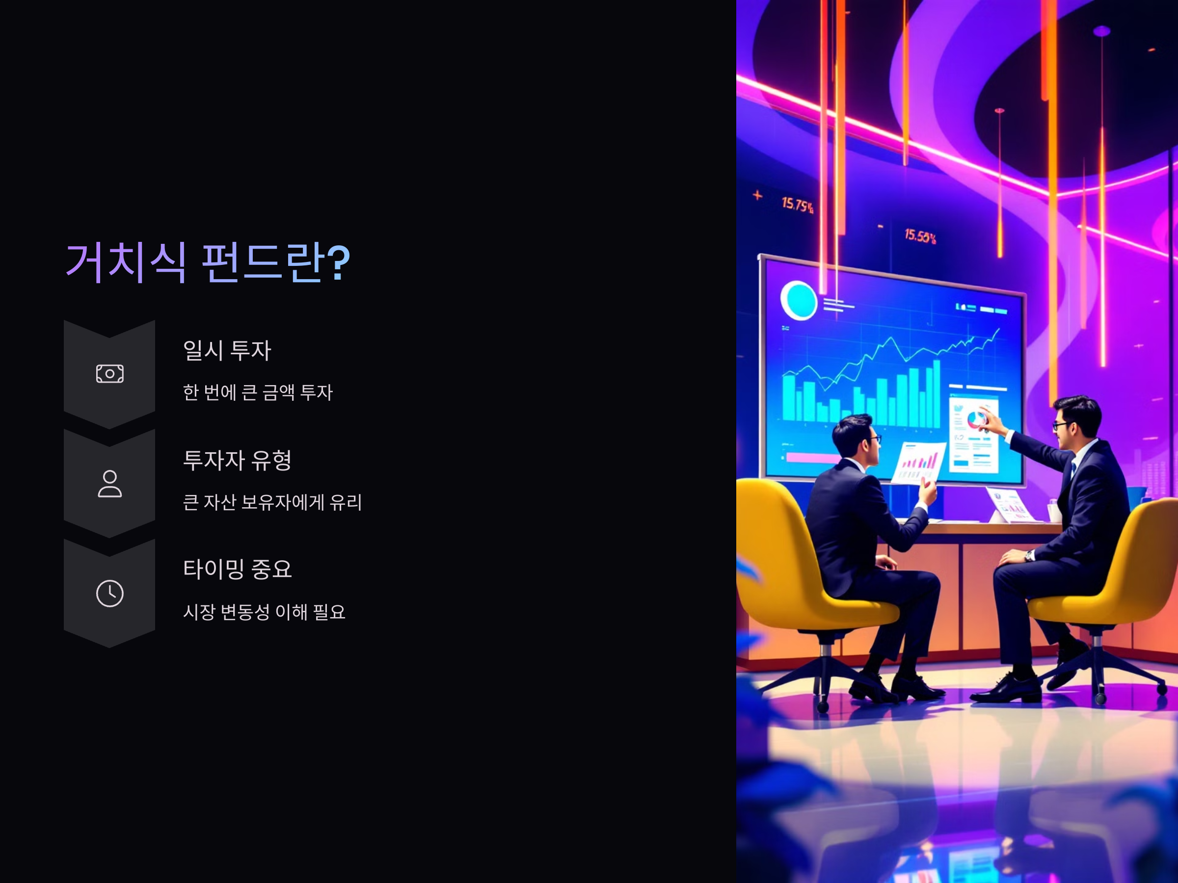 거치식 펀드는 큰 자금을 한 번에 투자하고자 하는 사람들에게 유리합니다. 특히, 시장의 상승기를 예측할 수 있는 능력이 있는 투자자들에게 유리합니다.