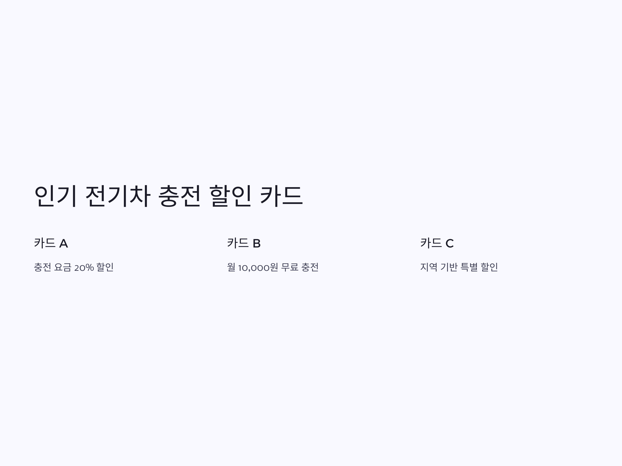 카드 C는 특정 지역의 전기차 충전소와 제휴되어 있는 카드입니다. 지역 거주자에게 유리하며, 해당 지역 내에서 충전할 때마다 특별 할인 혜택을 제공받을 수 있습니다. 예를 들어, 서울에서 자주 충전하는 사람이라면 서울 내 충전소에서 최대 30%까지 할인받을 수 있는 혜택이 주어집니다.
