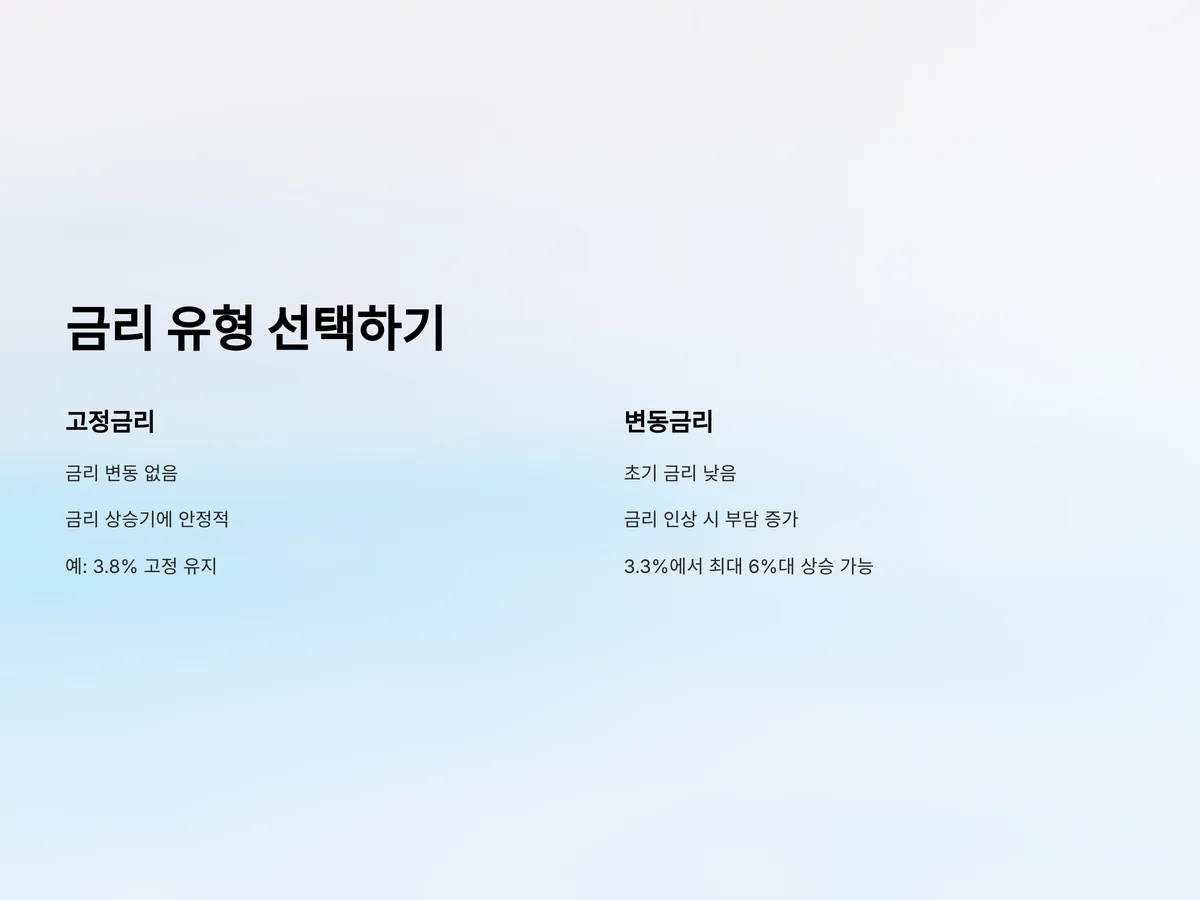 예를 들어, 고정금리로 연 3.8%를 선택했다면 향후 금리가 4.5%로 인상되더라도 기존 금리를 유지할 수 있지만, 변동금리로 3.3%를 선택했을 경우 금리 인상 시 최대 6%대까지 상승할 수 있어 큰 차이를 보일 수 있습니다. 따라서 금리 흐름을 예측하고 자신의 상환 능력과 리스크 감수 수준을 고려해 선택해야 합니다.