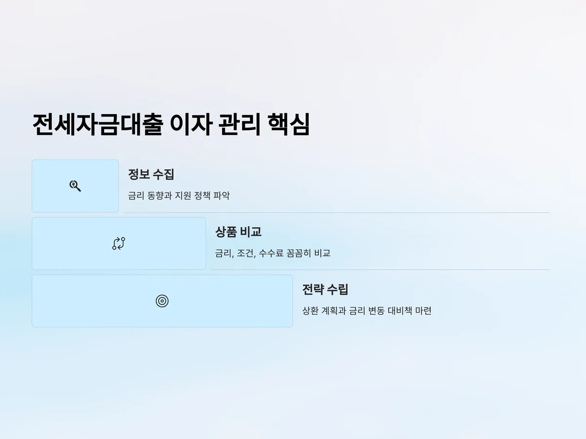 전세자금대출을 받은 많은 사람들이 가장 먼저 걱정하는 부분은 바로 '이자 부담'입니다. 금리 상승기에는 부담이 더 커지는데, 최근 한국은행 기준금리 동결에도 불구하고 시중은행의 주담대 및 전세대출 금리는 여전히 높은 수준을 유지하고 있어 주의가 필요합니다. 특히, 금리 상승에 대비해 고정금리와 변동금리 선택, 이자 지원 정책 등을 잘 활용해야 체계적인 재무관리가 가능합니다. 정부와 지자체의 다양한 지원제도도 활발히 운영 중이므로, 이를 적극 활용하면 실질적인 이자 부담을 낮출 수 있습니다.
