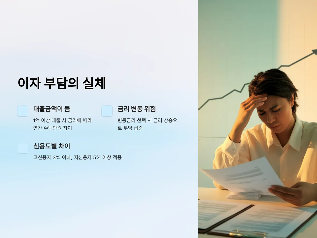 전세자금대출의 이자는 일반 대출보다 낮은 편이지만, 대출금액 자체가 크다 보니 월 이자 부담이 적지 않습니다. 보통 1억 원 이상을 대출받는 경우가 많기 때문에 금리에 따라 연간 수백만 원의 차이가 발생할 수 있습니다. 게다가 변동금리를 선택할 경우 금리가 오르면 이자 부담이 급격히 늘어나므로 더욱 주의해야 합니다.