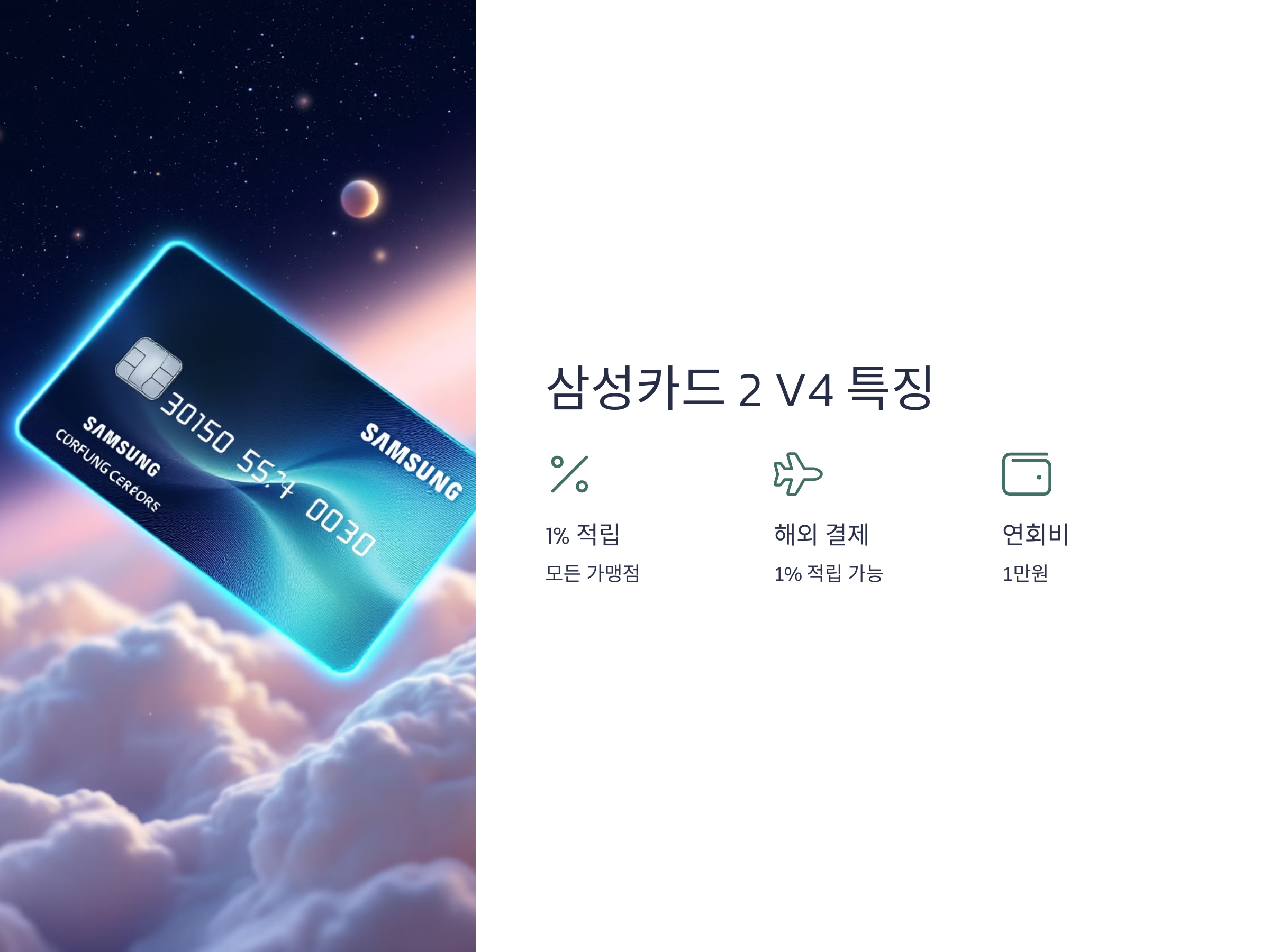 삼성카드 2 V4는 전월 실적 조건 없이 1% 적립 혜택을 제공합니다. 매달 일정 금액 이상을 사용하지 않아도 혜택을 누릴 수 있기 때문에 실적 걱정 없이 사용하기 좋습니다.