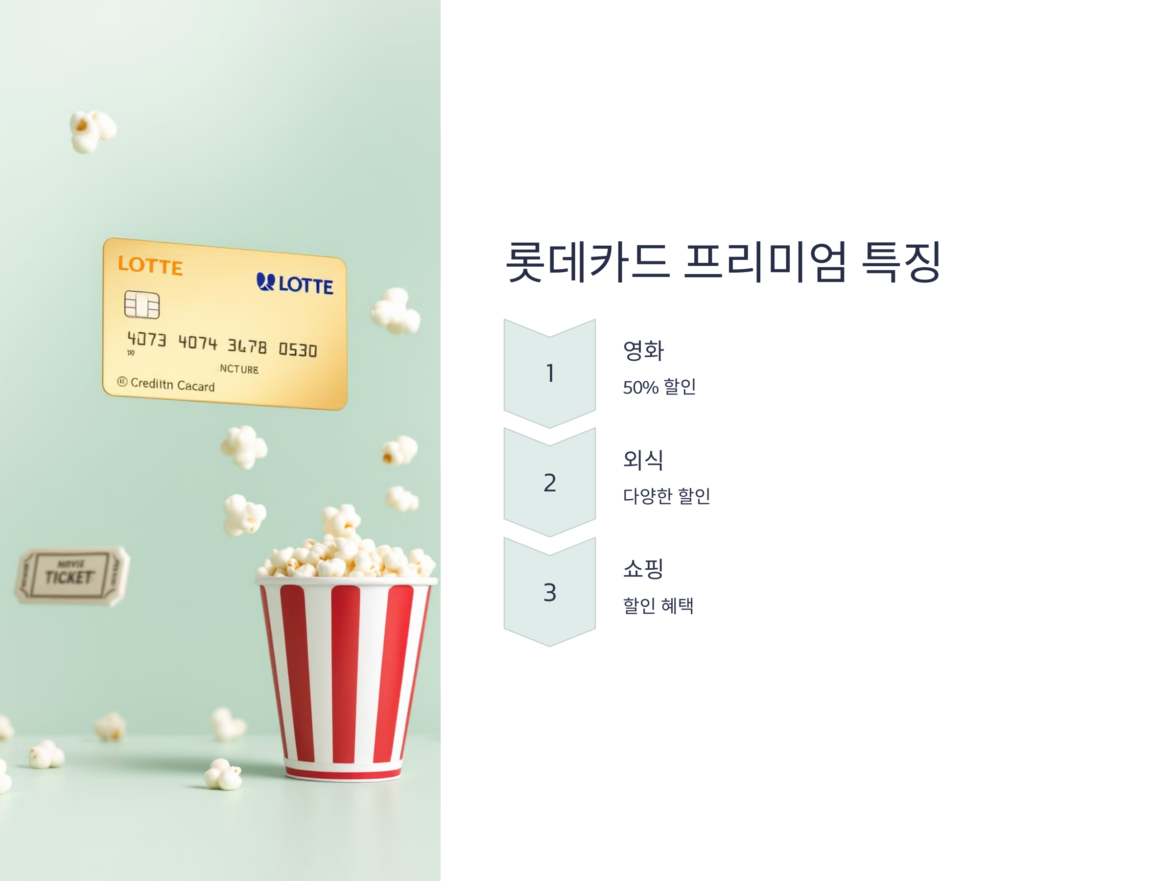 롯데카드 프리미엄 카드는 전월 실적 조건 없이 영화, 쇼핑, 외식에서 각기 다른 혜택을 제공합니다. 특히 영화 할인 혜택이 뛰어나 영화 관람을 자주 하시는 분들에게 추천합니다.
