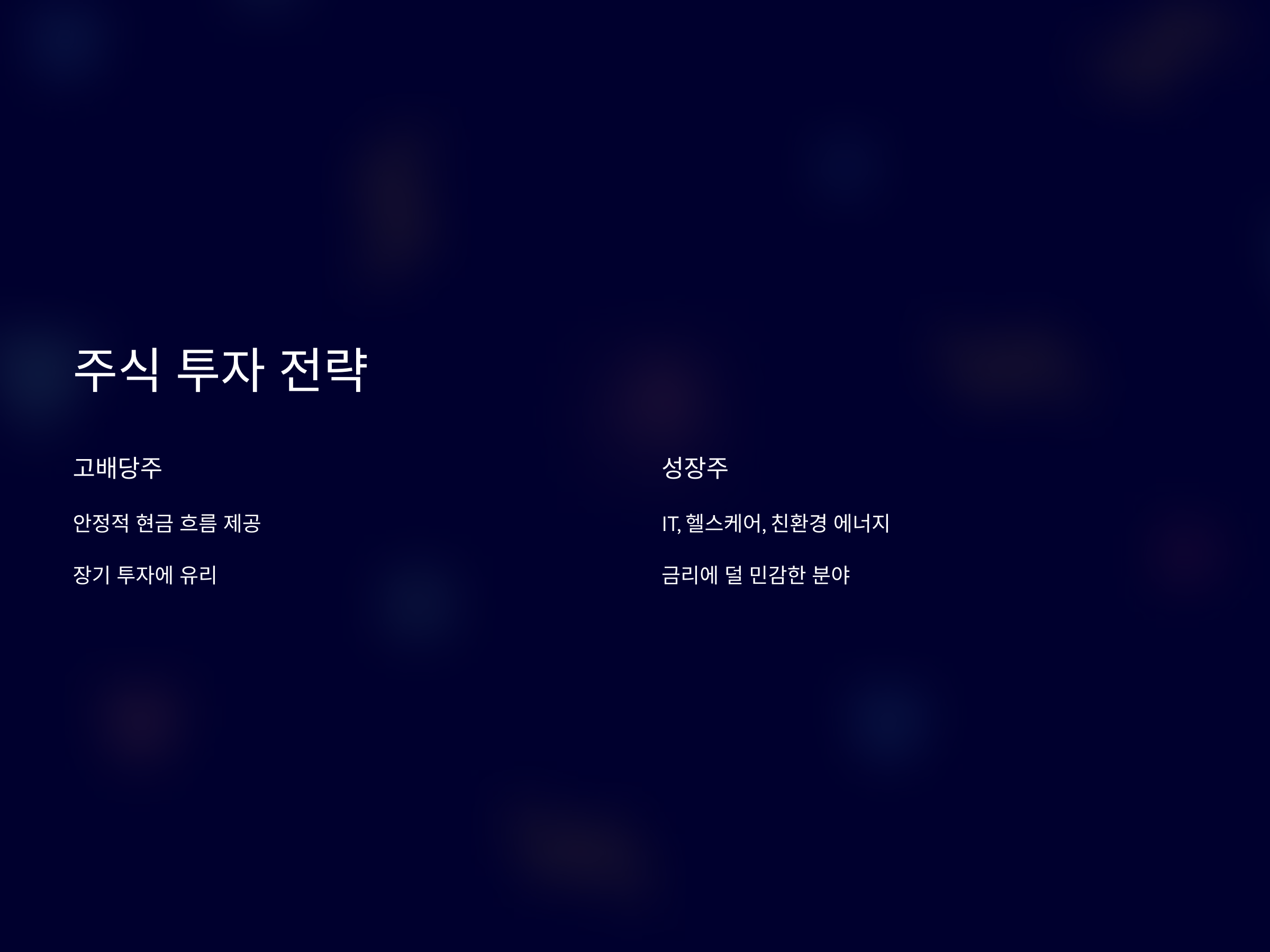 주식시장에서 특히 눈여겨봐야 할 점은 금리가 낮을수록 성장성이 높은 기업들이 주목받는다는 것입니다. 금리가 낮을수록 기업들은 자금을 더 쉽게 조달할 수 있고, 이는 기업 성장에 도움이 됩니다. 또한, 금융 분야 외에도 기술, 바이오, 헬스케어 등 성장 가능성이 높은 산업에 투자하는 것도 좋은 전략이 될 수 있습니다. 이러한 산업은 금리 변화에 비교적 덜 민감하고, 장기적인 성장이 기대됩니다.