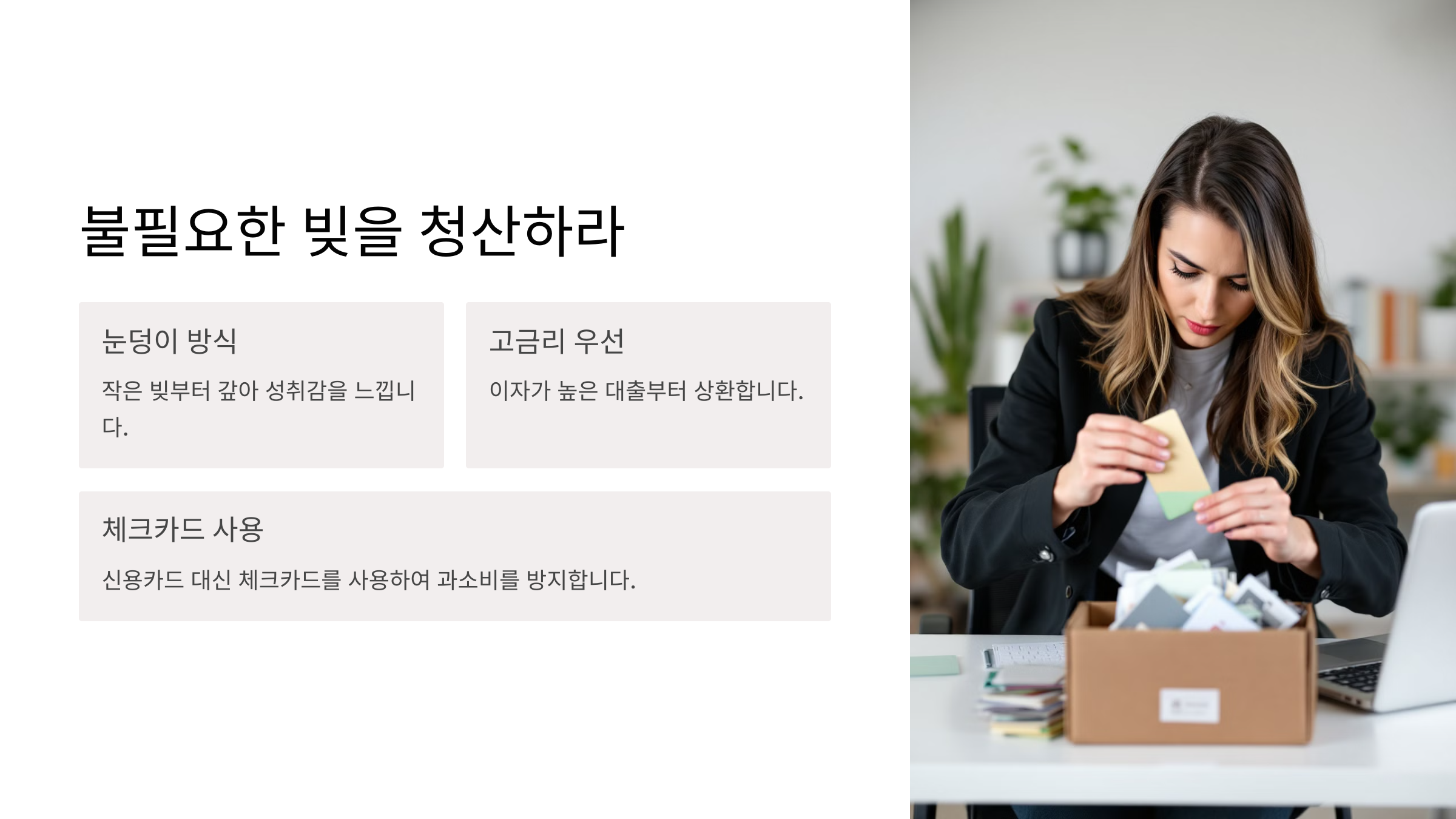 - 눈덩이 방식(Snowball Method): 작은 빚부터 갚아 성취감을 느끼기.