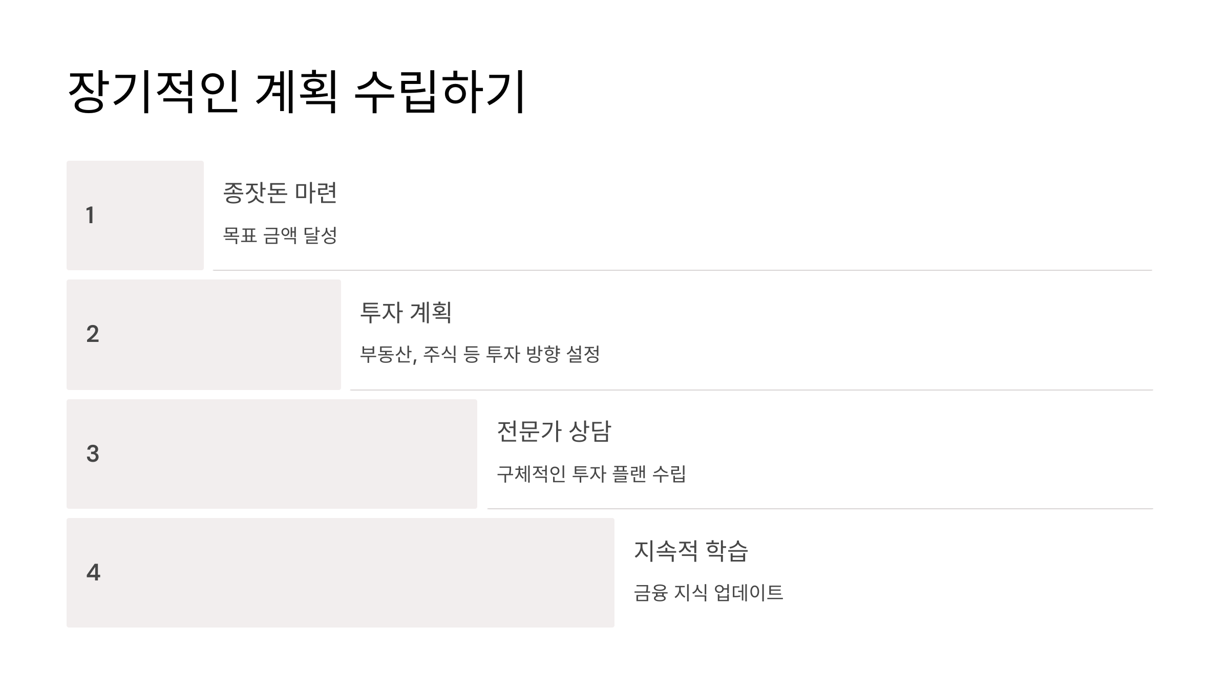종잣돈을 모은 뒤 이를 어떻게 활용할 것인지 계획을 세워야 합니다. 부동산, 주식 투자, 사업자금 등 큰 그림을 그리며 그에 맞는 준비를 하세요.
