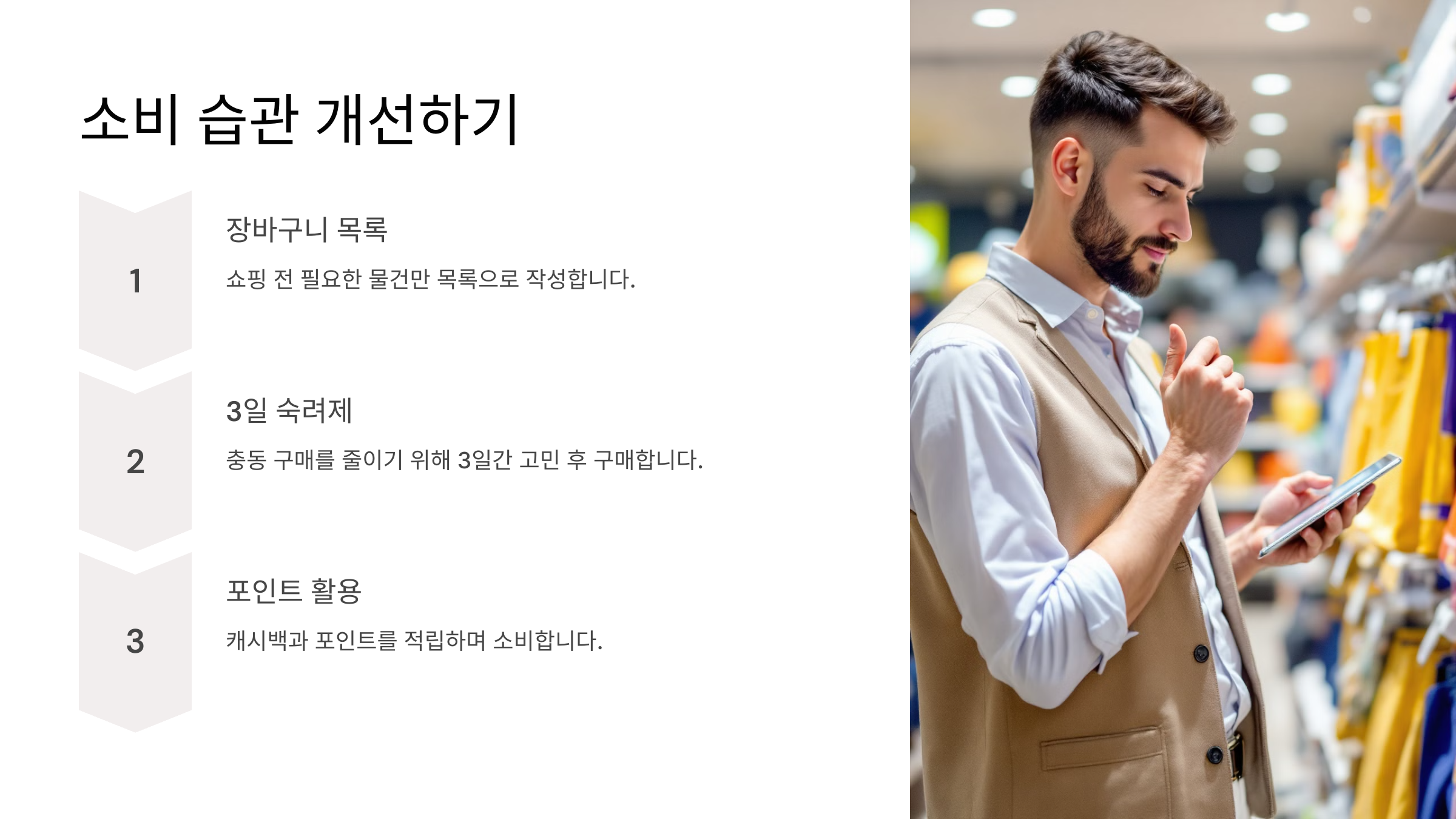 - "3일 숙려제" 활용: 사고 싶은 물건을 바로 사지 않고 3일 고민하기.