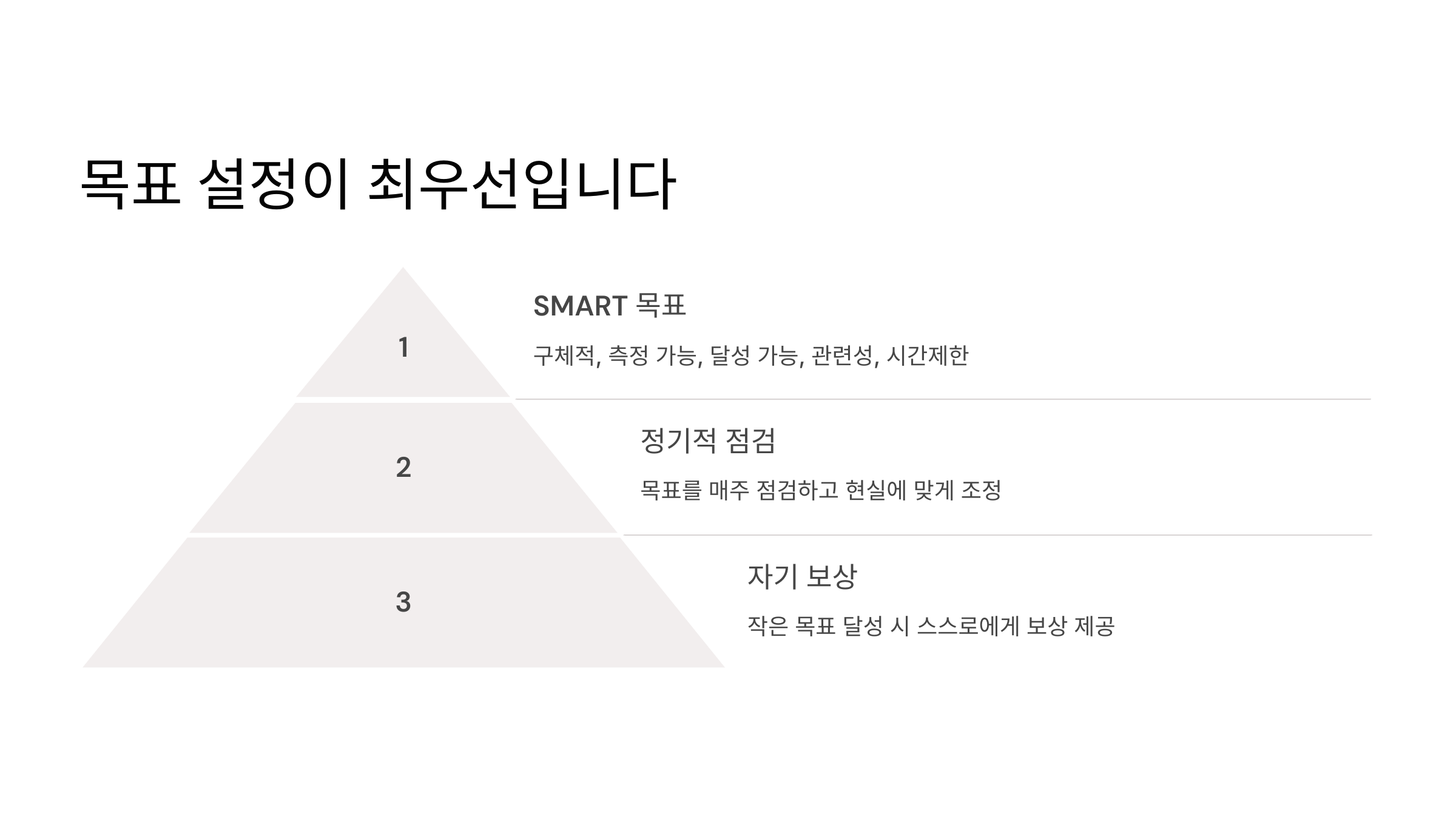 - 목표를 매주 점검하여 현실에 맞게 조정합니다.