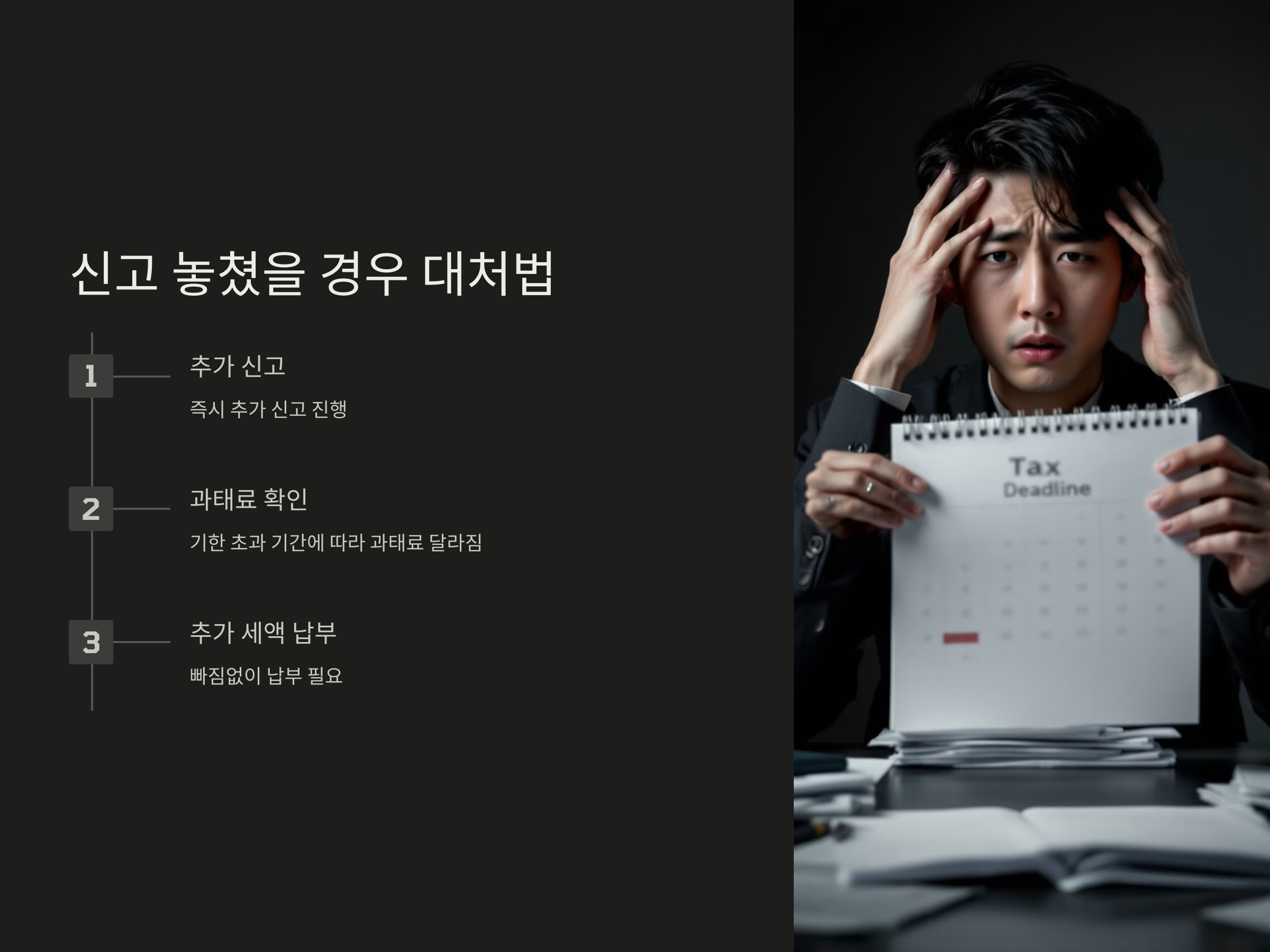 만약 종합소득세 신고를 놓쳤다면, 바로 추가 신고를 해야 합니다. 이때 발생할 수 있는 과태료는 신고 기한을 넘긴 기간에 따라 다르게 부과되므로, 빠르게 신고하는 것이 중요합니다. 또한, 추가로 납부할 세액이 있을 경우, 이 또한 빠짐없이 납부해야 합니다.