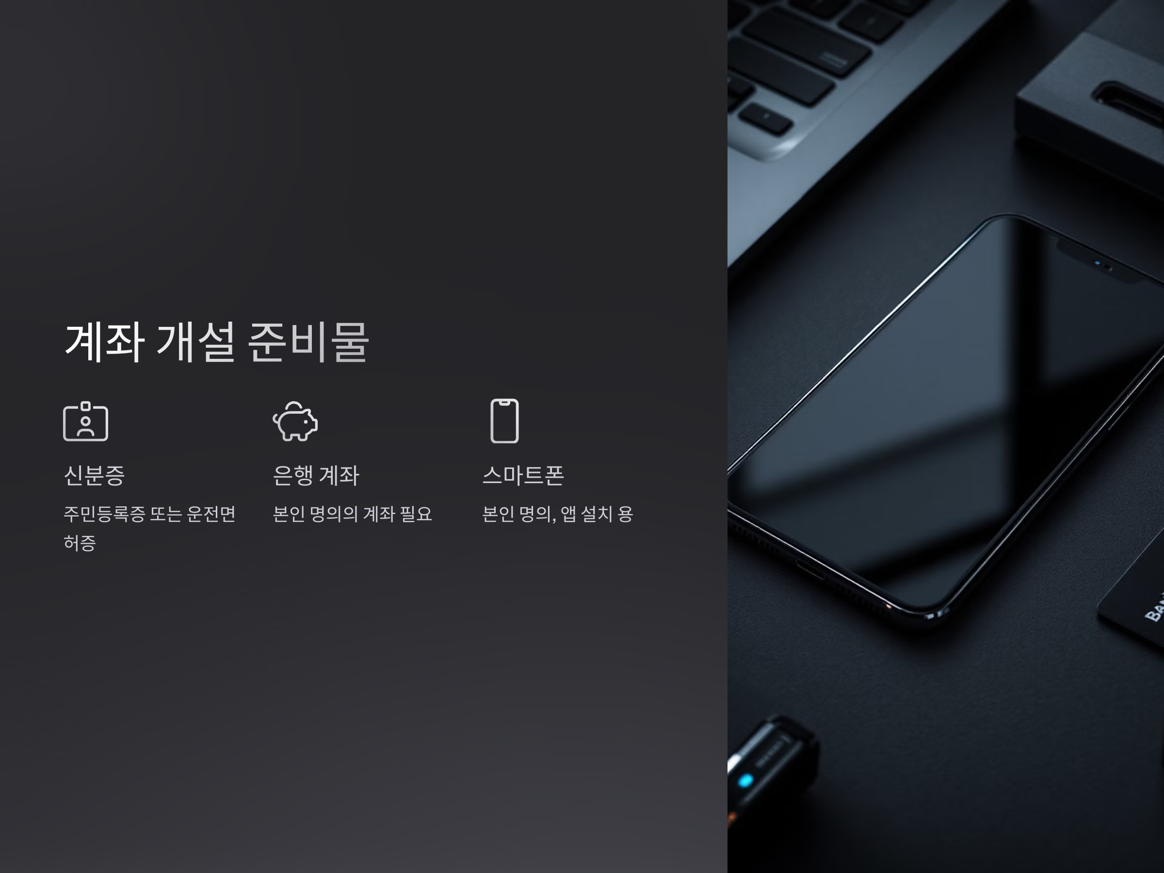 - 본인 명의의 스마트폰: 계좌 개설 앱 설치 및 본인 인증을 위해 필요