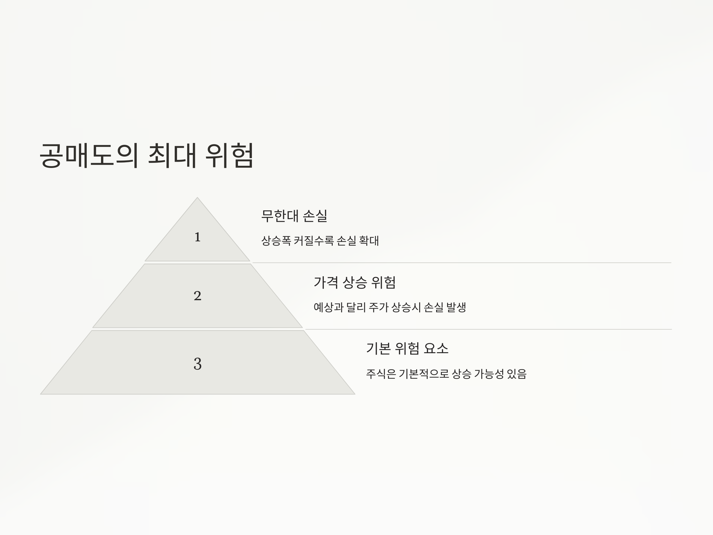 공매도에서 가장 큰 위험은 바로 "가격 상승"입니다. 주식은 기본적으로 상승할 수 있기 때문에, 상승장이 이어지면 공매도를 진행한 투자자는 큰 위험에 처할 수 있습니다. 주식 가격의 상승폭이 예상보다 커지면, 매수할 때마다 더 많은 금액을 지불해야 하며, 이로 인해 손실이 빠르게 확대될 수 있습니다.
