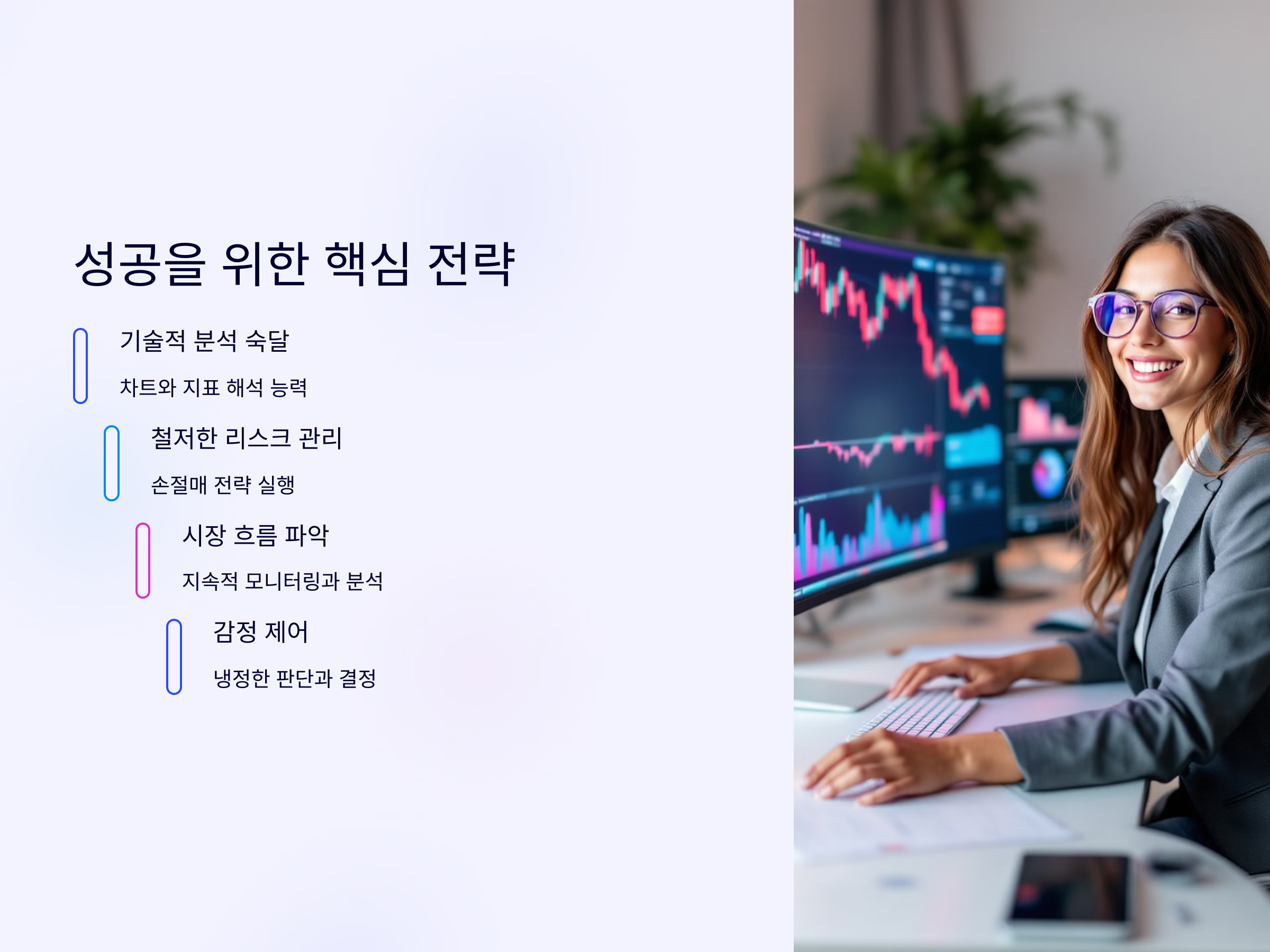 단기 트레이딩에서 성공하려면 기술적 분석, 리스크 관리, 시장 흐름 파악 등 다양한 요소를 종합적으로 고려해야 합니다. 또한, 종목 선정과 매수 타이밍을 정확히 맞추고, 감정을 제어하는 능력을 기르는 것이 중요합니다. 빠르게 변화하는 시장에서 효과적으로 대응하려면 꾸준한 연습과 경험이 필요합니다.