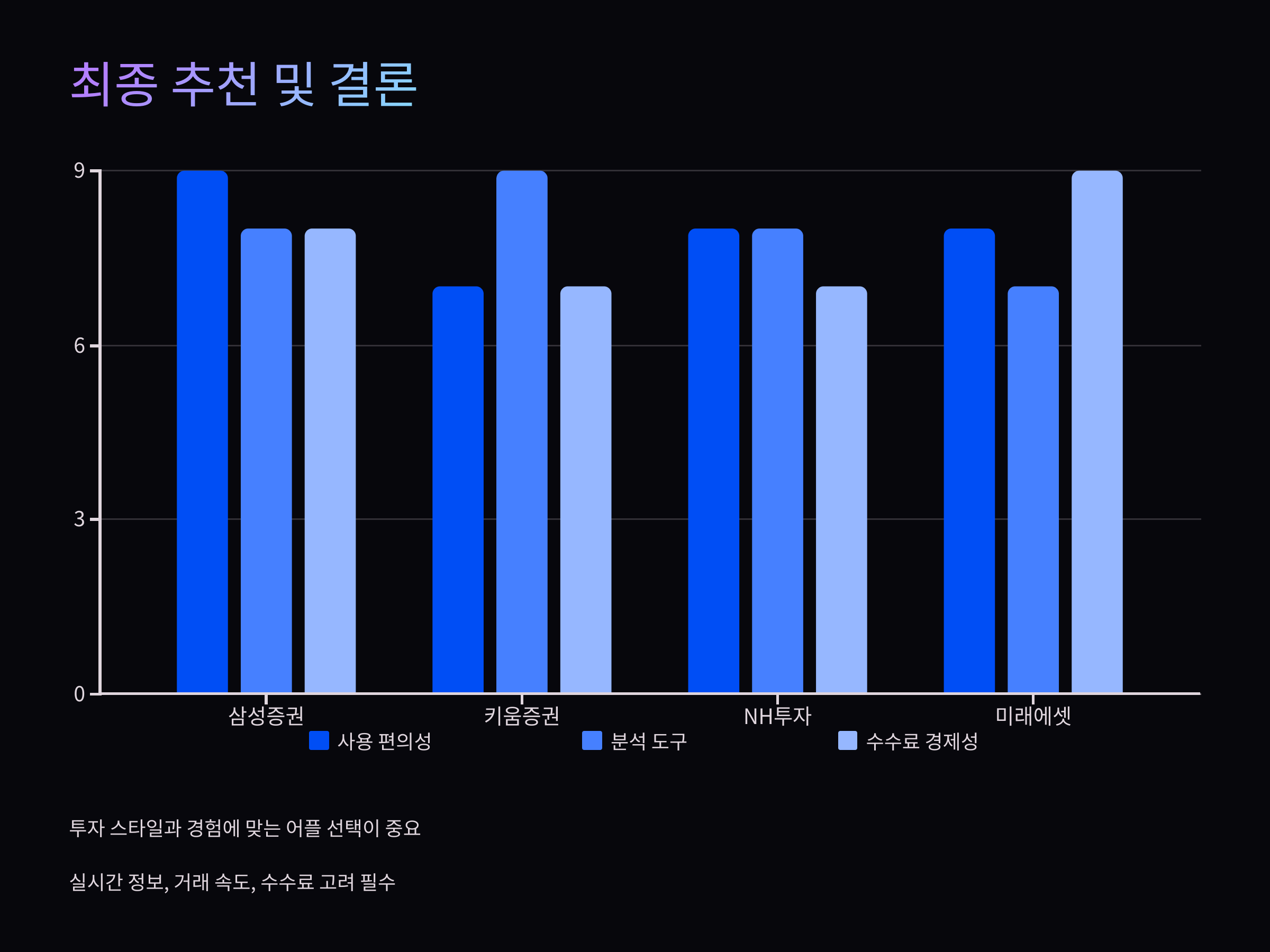 주식 어플을 선택하는 기준은 각자 다를 수 있습니다. 초보 투자자라면 사용이 간편한 삼성증권 MTS나 미래에셋대우 MTS를 추천드립니다. 반면, 차트 분석이나 AI 기반 투자 조언이 중요한 전문 투자자에게는 키움증권 영웅문4나 NH투자증권 QV가 더 적합할 수 있습니다.
