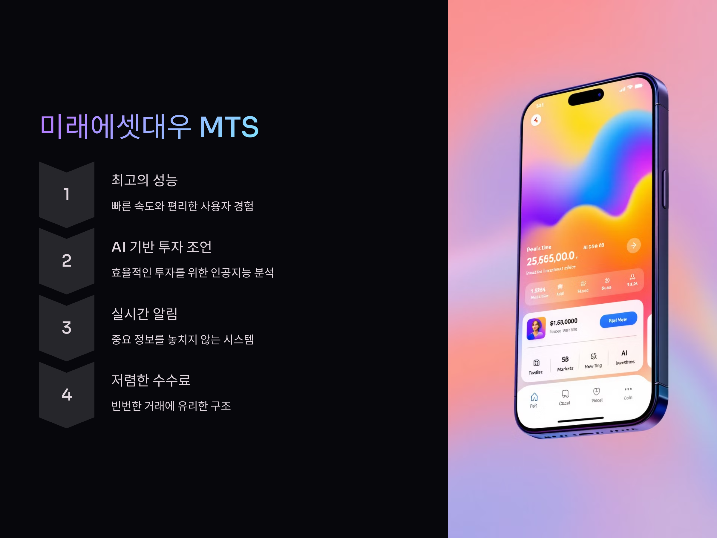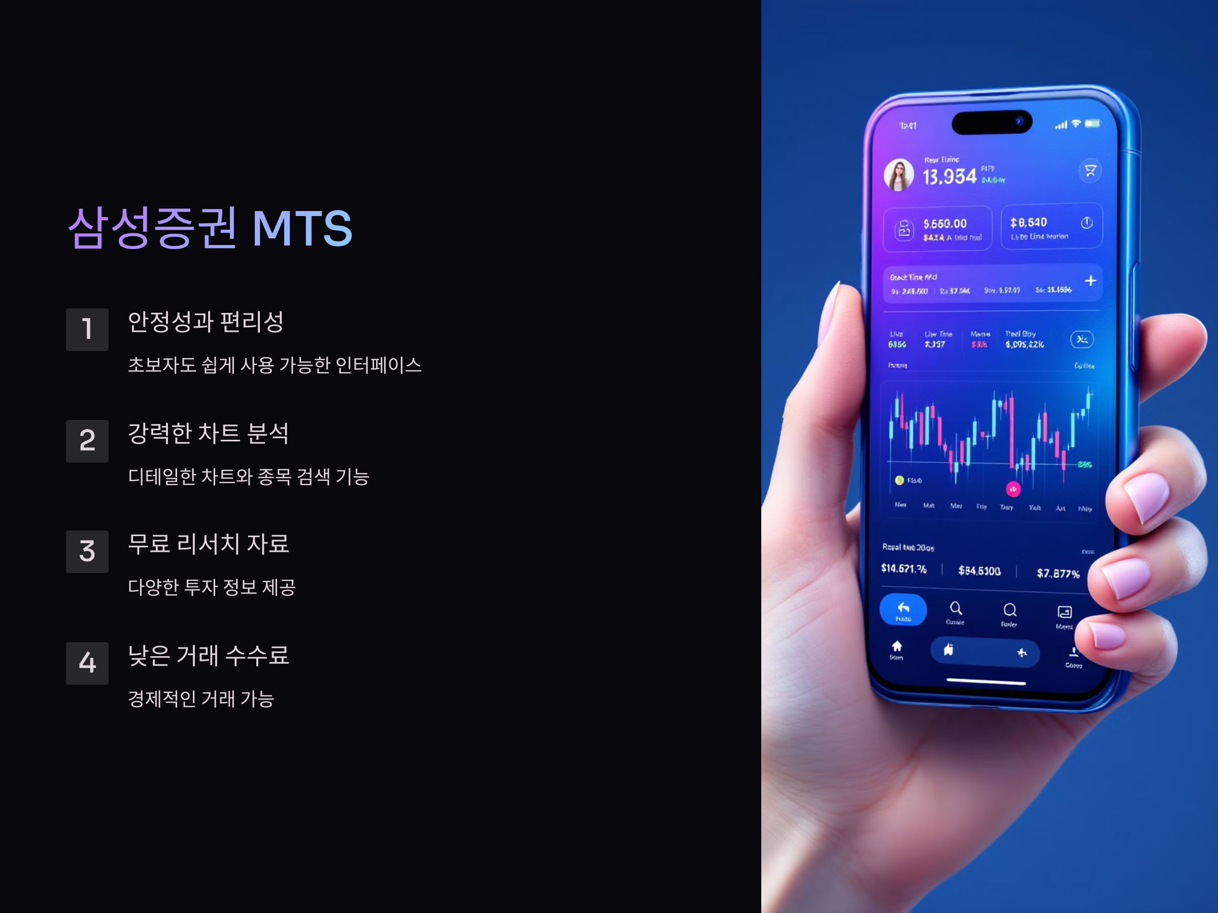 삼성증권의 MTS(모바일 거래 시스템)는 안정성과 사용 편리성을 모두 갖춘 어플로, 특히 실시간 시세 제공과 차트 분석 도구가 강력한 특징입니다. 사용자들은 무료로 제공되는 다양한 리서치 자료와 함께, AI 투자 분석 서비스를 통해 시장 트렌드에 맞는 추천을 받을 수 있습니다. 또 삼성증권 MTS는 거래 수수료가 낮고 보안이 강화된 시스템을 갖추고 있어 많은 투자자들에게 인기가 높습니다.