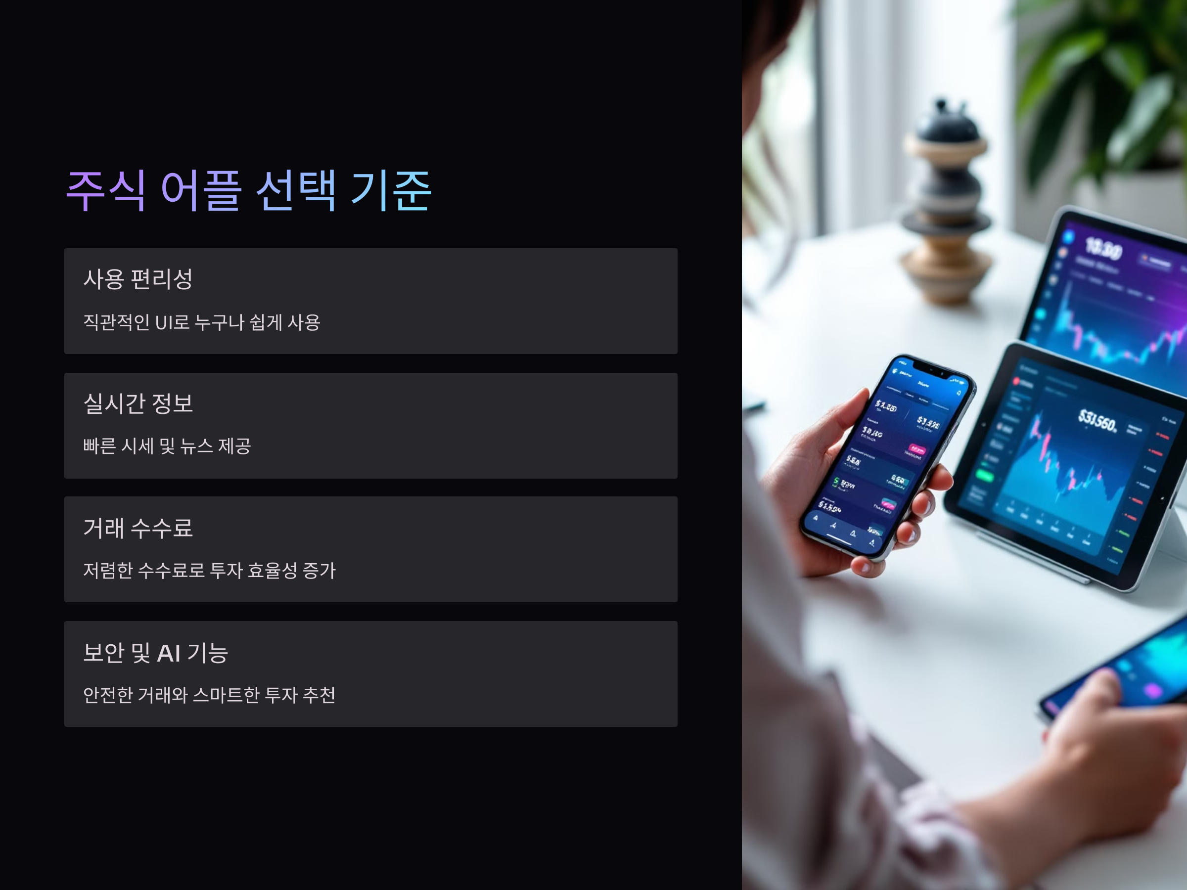 주식 어플을 선택할 때 가장 중요한 기준은 무엇일까요? 바로 사용의 편리성, 실시간 정보 제공, 거래 수수료, 그리고 보안입니다. 이러한 기본적인 기준을 충족하는 어플이라면 누구나 쉽게 사용할 수 있으며, 안정적으로 거래를 할 수 있습니다. 최근에는 더 나아가 AI 기반의 투자 추천 서비스나 트렌드 분석 기능을 제공하는 어플도 증가하고 있어 투자자의 투자 효율성을 높여주고 있습니다.