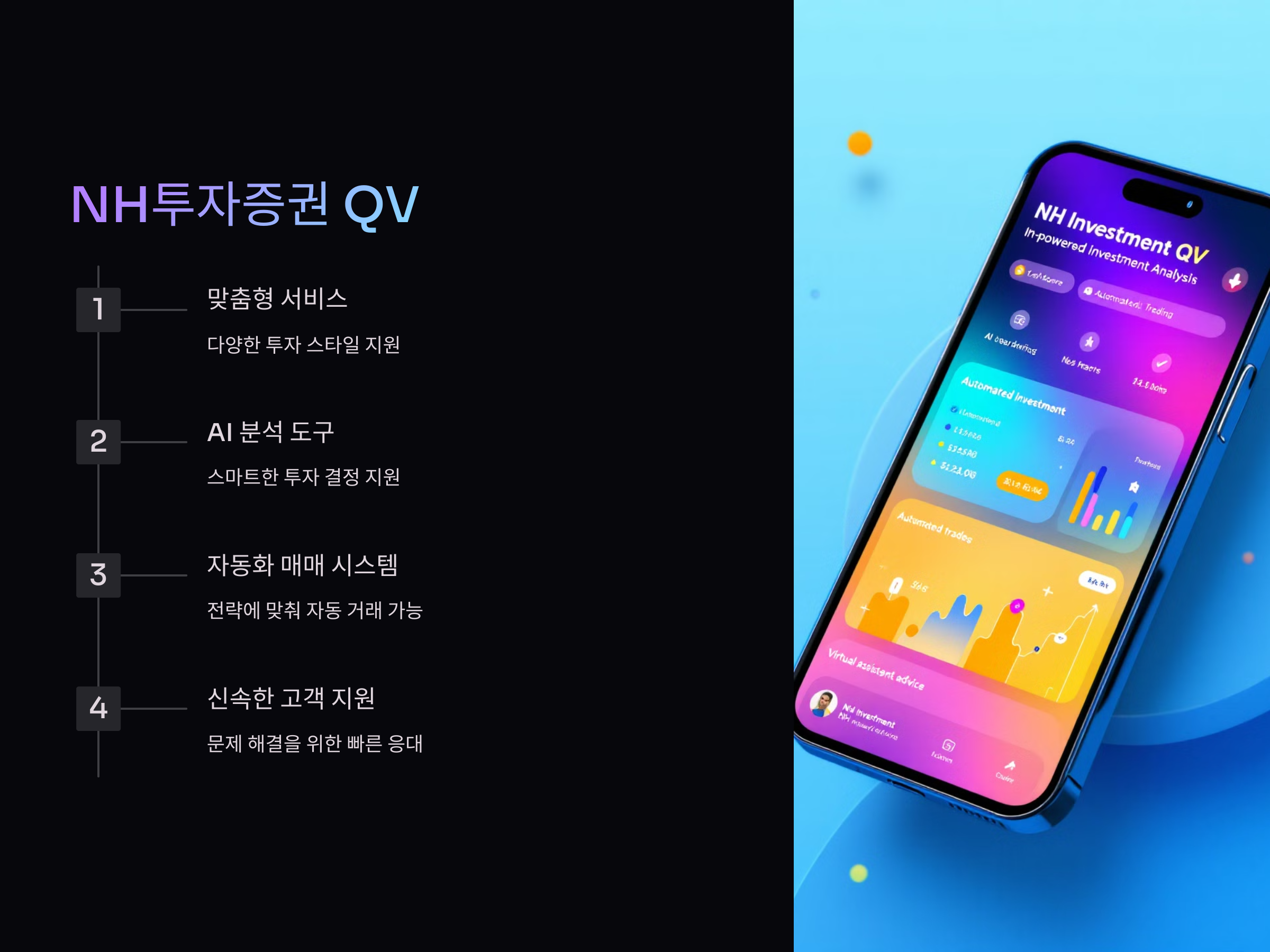 NH투자증권의 QV 어플은 투자자들이 가장 신뢰하는 어플 중 하나입니다. 초보자부터 전문가까지 다양한 투자 스타일을 지원하며, 모바일에서 제공되는 리서치와 AI 분석 도구가 특징입니다. 또한, 자동화된 매매 시스템을 통해 투자자들이 자신의 전략에 맞춰 자동으로 매매를 진행할 수 있습니다.