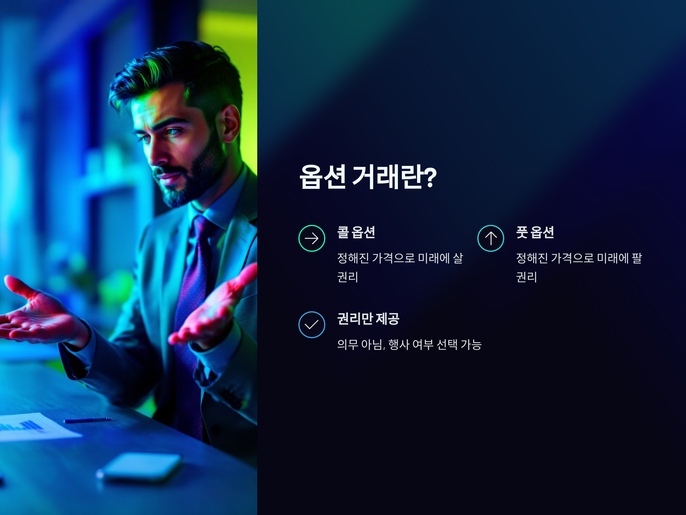 이러한 옵션은 투자자에게 "권리"만을 제공하며, 의무가 아닙니다. 이는 주식과의 큰 차이점입니다. 주식을 구매하면 그 주식을 보유하는 의무가 생기지만, 옵션의 경우 옵션을 행사할지 말지를 선택할 수 있기 때문입니다. 이렇게 권리를 통해 리스크를 관리할 수 있다는 점에서 옵션은 많은 투자자들 사이에서 유용한 도구로 활용됩니다.
