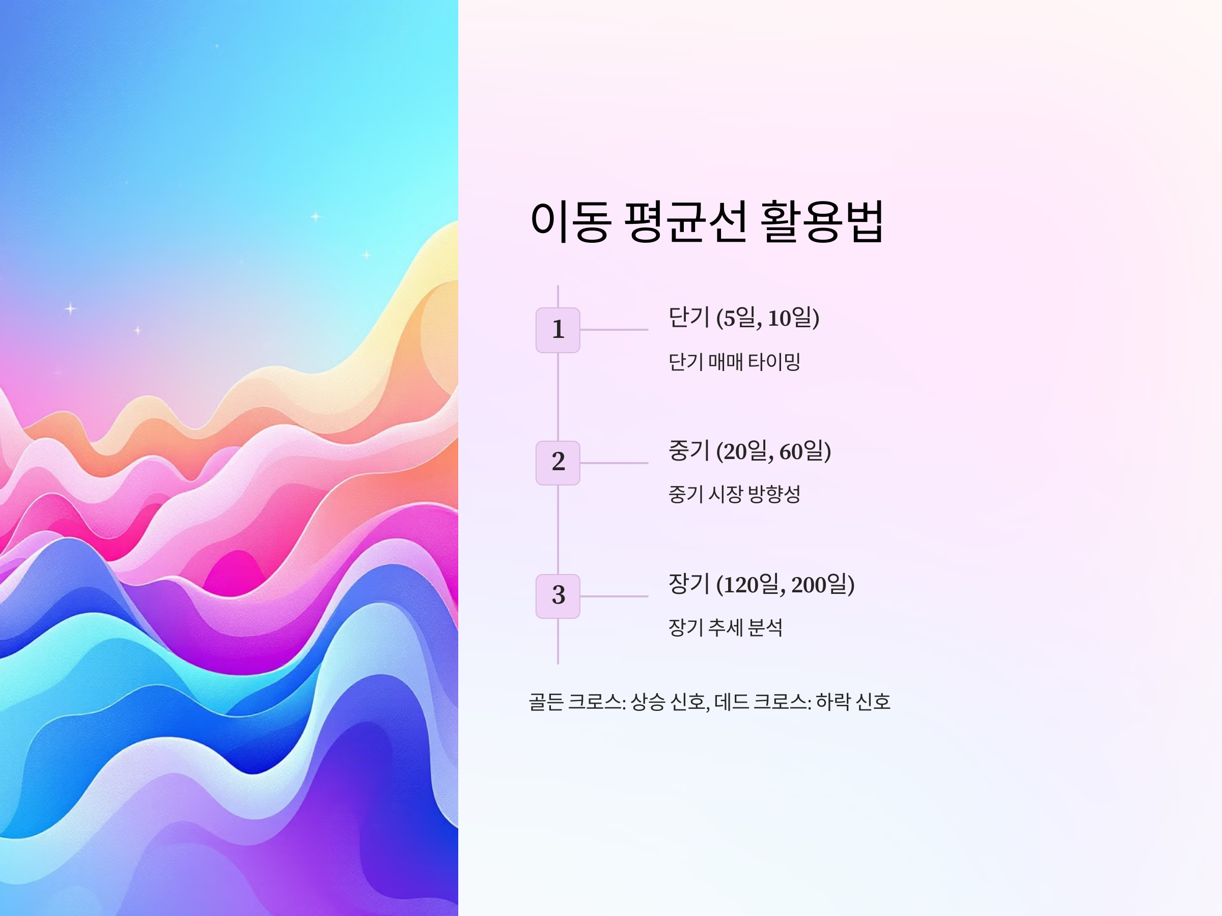 - 골든 크로스(Golden Cross): 단기선이 장기선을 상향 돌파할 때, 강한 상승 신호