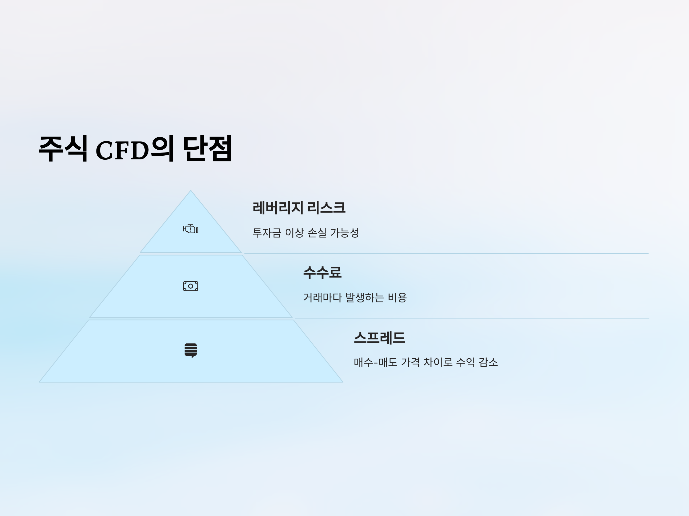 물론 주식 CFD에도 단점은 존재합니다. 첫 번째 단점은 바로 레버리지 리스크입니다. 레버리지를 통해 큰 수익을 얻을 수 있지만, 그만큼 큰 손실을 입을 위험도 커집니다. 레버리지를 과도하게 사용하면, 투자금 이상의 손실을 볼 수도 있기 때문에, 이를 관리하는 것이 매우 중요합니다.