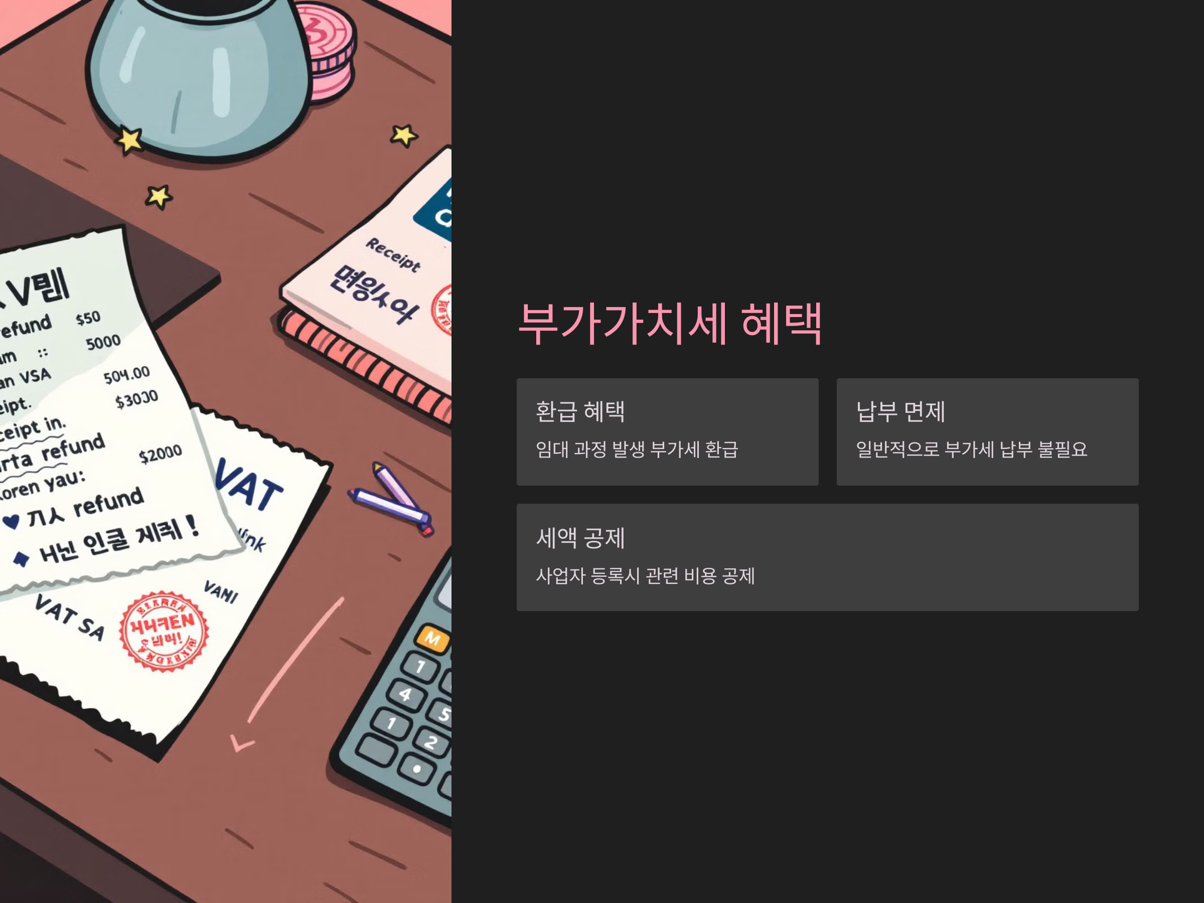 주택임대사업자는 또한 부가가치세 관련 혜택도 제공합니다. 주택임대사업자는 주택을 임대하는 과정에서 발생하는 부가가치세를 환급받을 수 있는 혜택을 누릴 수 있습니다. 일반적으로 주택임대사업자는 부가가치세를 납부하지 않지만, 사업자로 등록된 경우, 관련 비용에 대해 세액을 공제받을 수 있습니다.