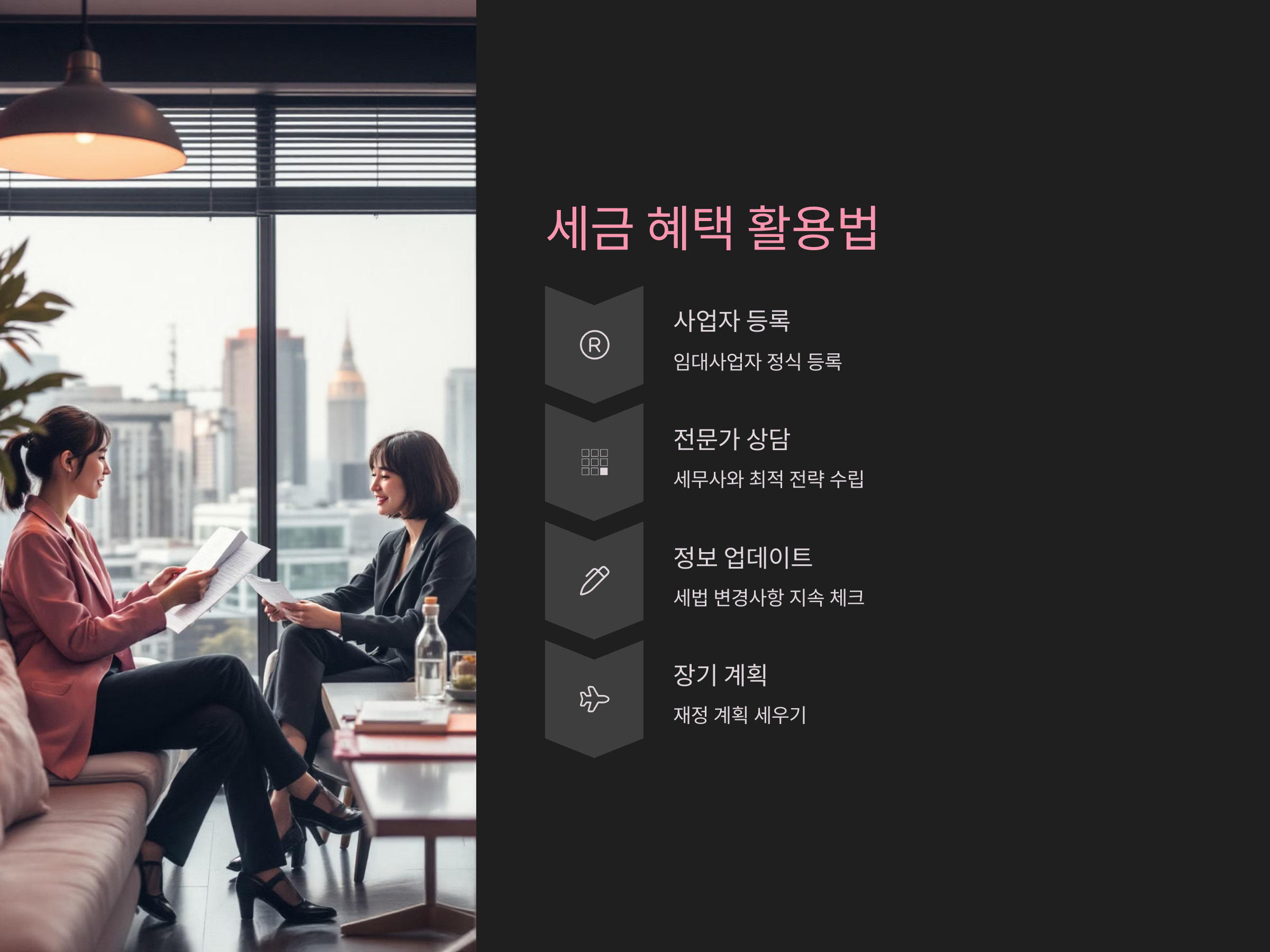 주택임대사업자가 세금 혜택을 제대로 활용하려면, 세무 전문가와 상의하여 자신의 상황에 맞는 최적의 절세 전략을 세우는 것이 중요합니다. 또한, 주택임대사업자로 등록한 후, 지속적으로 세법 변경 사항을 체크하고, 정부의 정책을 잘 파악하는 것이 필요합니다.
