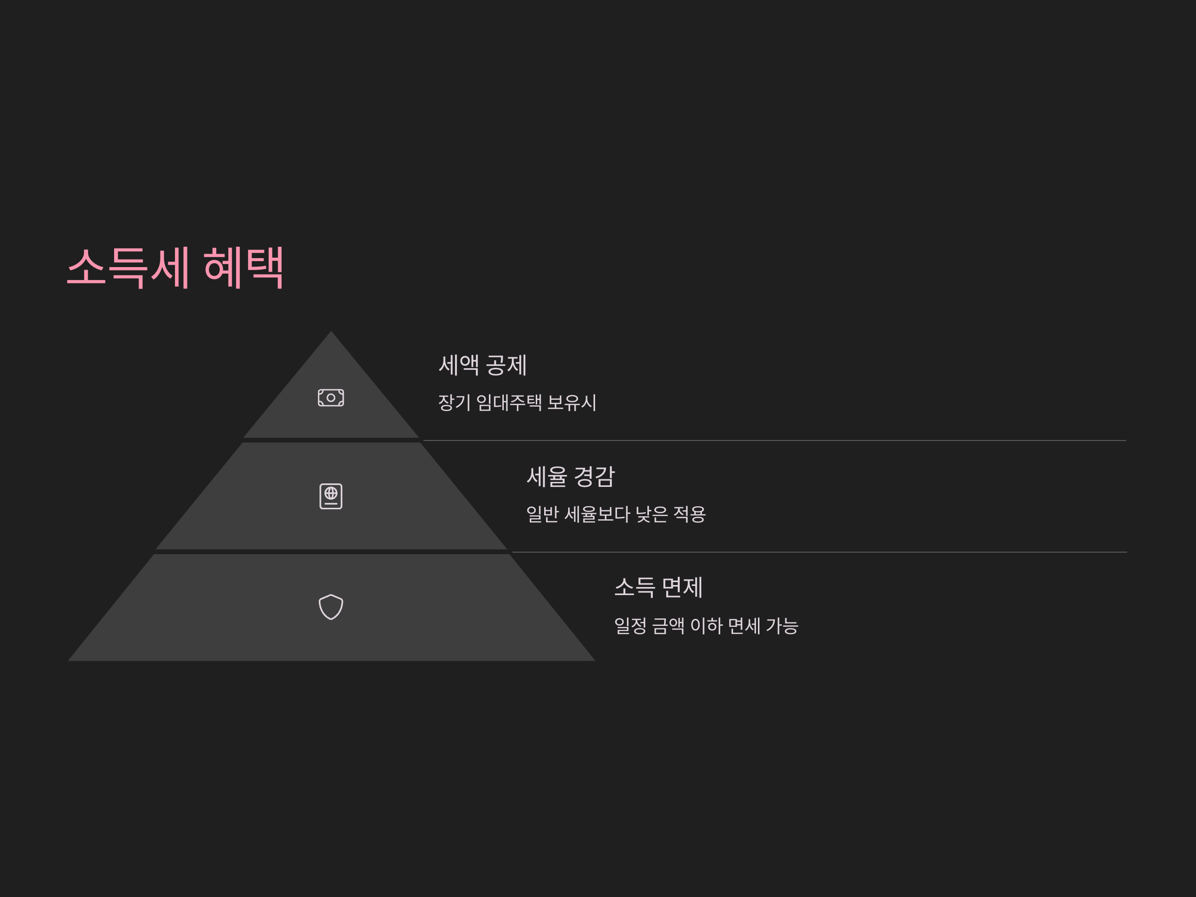 주택임대사업자에게는 임대 소득에 대해 일반 세율을 적용하는 것이 아니라, 세액을 일정 부분 경감시켜주는 방식으로 운영됩니다. 또한 임대 수입이 일정 금액 이하일 경우, 그 금액에 대해 소득세를 면제해 주는 경우도 있어 부담을 크게 줄일 수 있습니다.