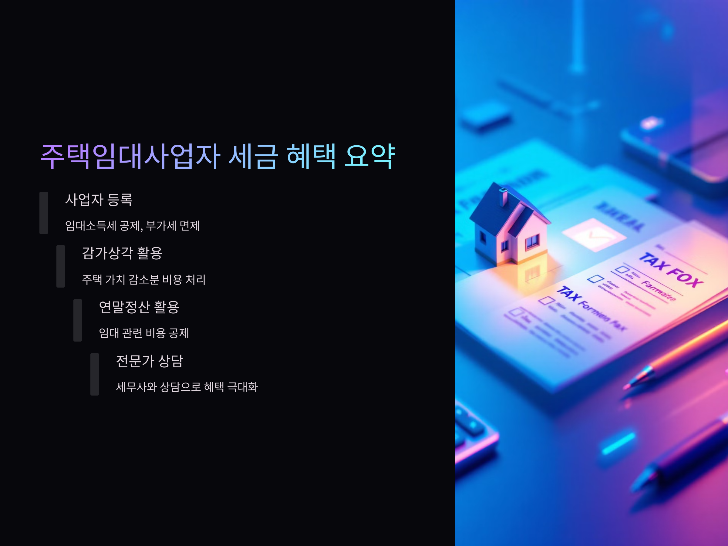 주택임대사업자의 세금 혜택을 최대한 활용하려면, 관련 법규를 정확히 이해하고, 각종 세금 신고 시 유리한 조건들을 놓치지 않아야 합니다. 이를 통해 세금 절감은 물론, 사업을 더욱 효율적으로 운영할 수 있습니다.