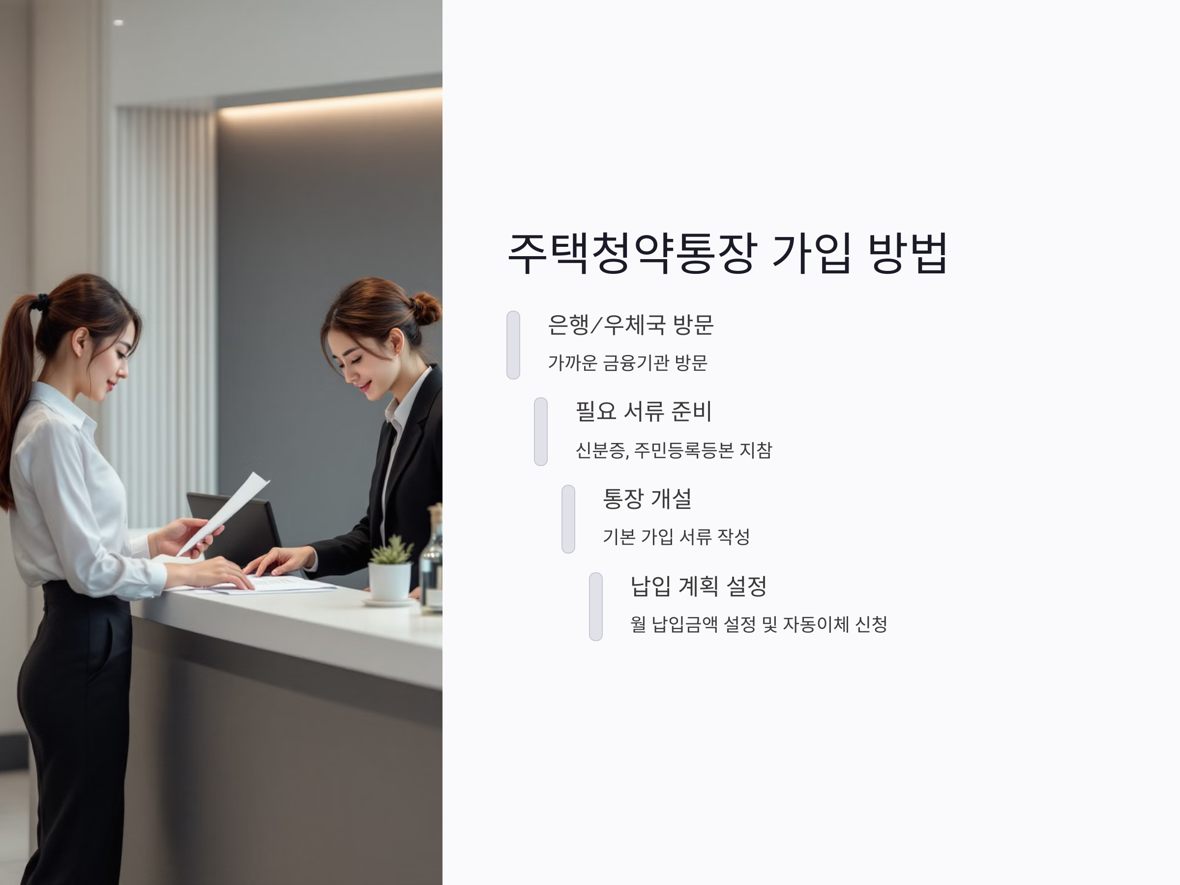 주택청약통장은 은행과 우체국 등에서 가입할 수 있으며, 가입 방법은 간단합니다. 대부분의 경우 은행에 방문하여 통장을 개설하고, 일정 금액을 입금하는 방식으로 가입 절차가 이루어집니다. 각 은행에서는 주택청약통장에 대한 안내를 제공하며, 기본적인 가입 서류만 준비하면 됩니다.
