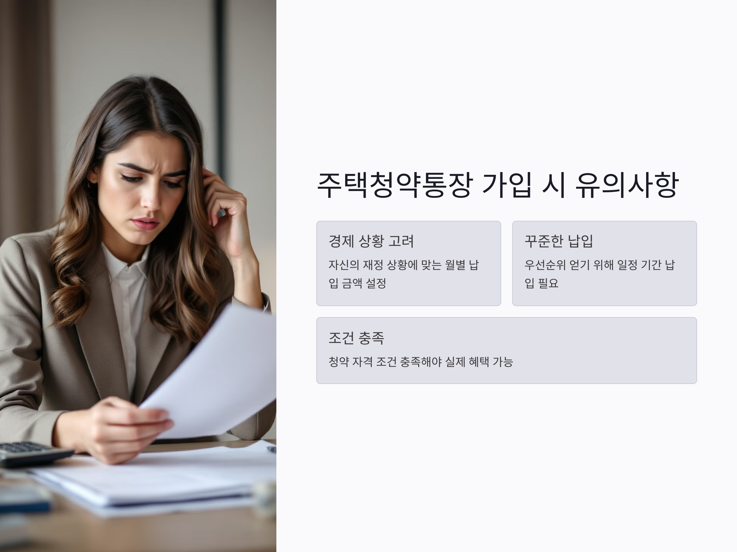 주택청약통장 가입 시 몇 가지 유의해야 할 사항들이 있습니다. 첫 번째로는, 주택청약통장은 일정 기간 동안 일정 금액을 꾸준히 납입해야 하기 때문에, 자신의 경제 상황을 고려하여 가입하는 것이 중요합니다. 급격한 재정적인 변화가 생길 경우 납입이 어려워질 수 있으므로, 월별 납입 금액을 현실적으로 설정하는 것이 좋습니다.