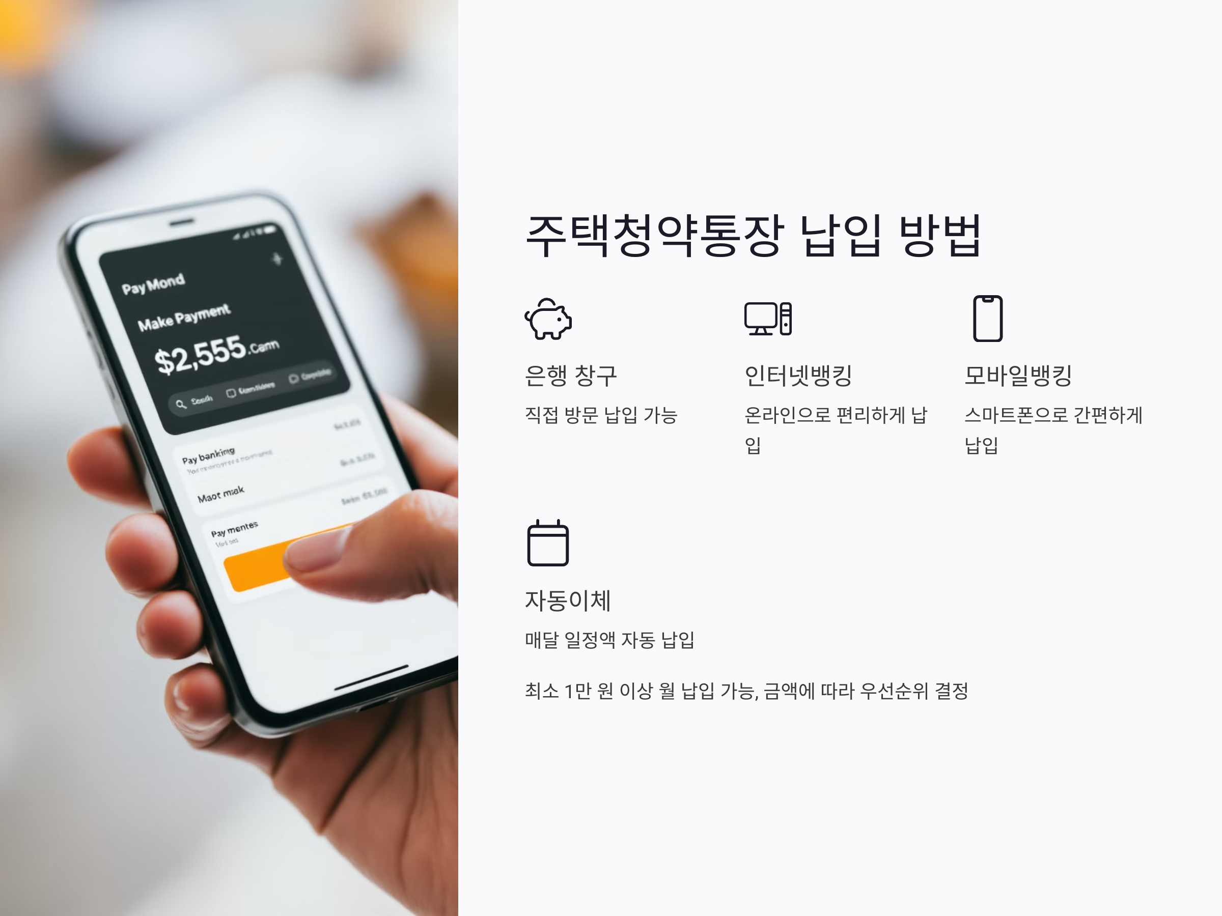 주택청약통장은 정기적인 납입이 중요한데, 납입 방법은 직접 은행 창구를 통해 할 수 있습니다. 또한 인터넷뱅킹, 모바일뱅킹을 통해 자동이체 설정을 하여 매달 꾸준히 납입할 수 있습니다. 이 방식은 시간과 노력을 절약할 수 있어 많은 사람들이 이용합니다.