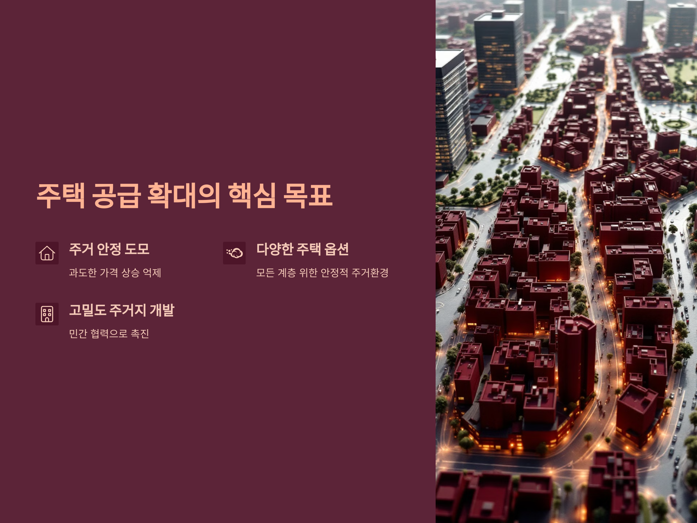 주택 공급 확대 정책은 단순히 새로운 주택을 건설하는 것에 그치지 않습니다. 이 정책의 가장 중요한 목표는 주거 안정을 도모하고, 주택 시장의 과도한 가격 상승을 억제하는 데 있습니다. 또한, 경제적 여건에 맞는 다양한 주택 옵션을 제공하여 모든 계층이 안정적인 주거 환경을 확보할 수 있도록 하는 것입니다.