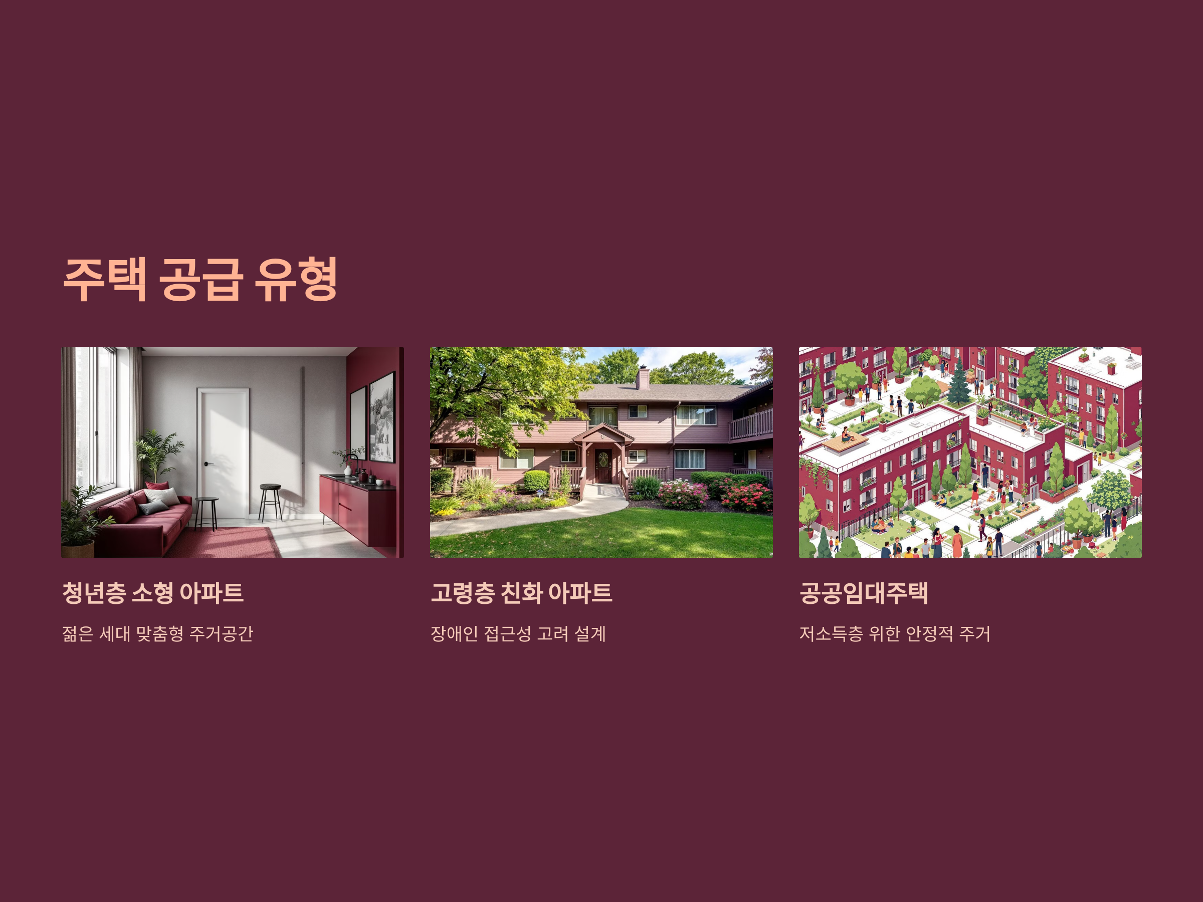 셋째, 주택 공급의 다양화가 이루어지면, 다양한 계층이 자신에게 맞는 주택을 선택할 수 있게 되어 주거의 질이 향상될 것입니다. 특히, 저소득층과 청년층에게는 보다 안정적이고 질 높은 주거 환경을 제공할 수 있을 것입니다.