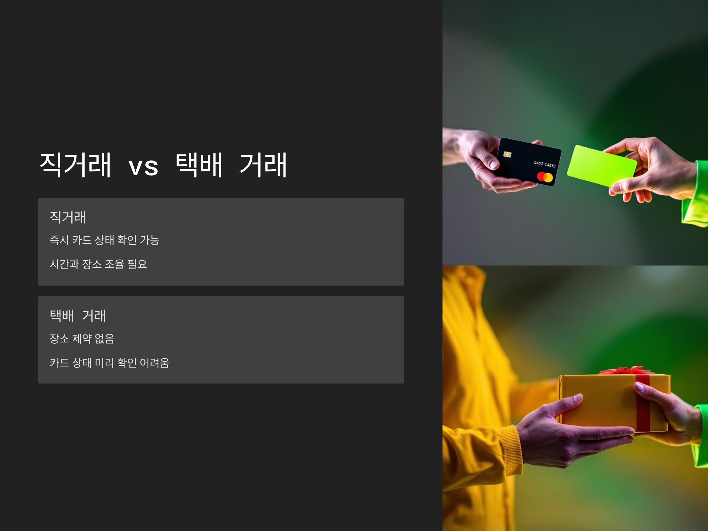 중고나라에서 카드 거래를 할 때 직거래와 택배 거래 중 어떤 방법을 선택할지 고민할 수 있습니다. 두 거래 방식은 각각 장단점이 있으며, 어떤 방법을 선택할지에 따라 거래의 안전성도 달라질 수 있습니다. 직거래는 당일 바로 거래가 이루어지고, 카드의 상태를 직접 확인할 수 있는 장점이 있지만, 거래 상대방과의 시간과 장소를 맞추는 것이 번거로울 수 있습니다. 반면 택배 거래는 장소에 구애받지 않지만, 카드의 상태를 미리 확인하기 어려운 단점이 있습니다.