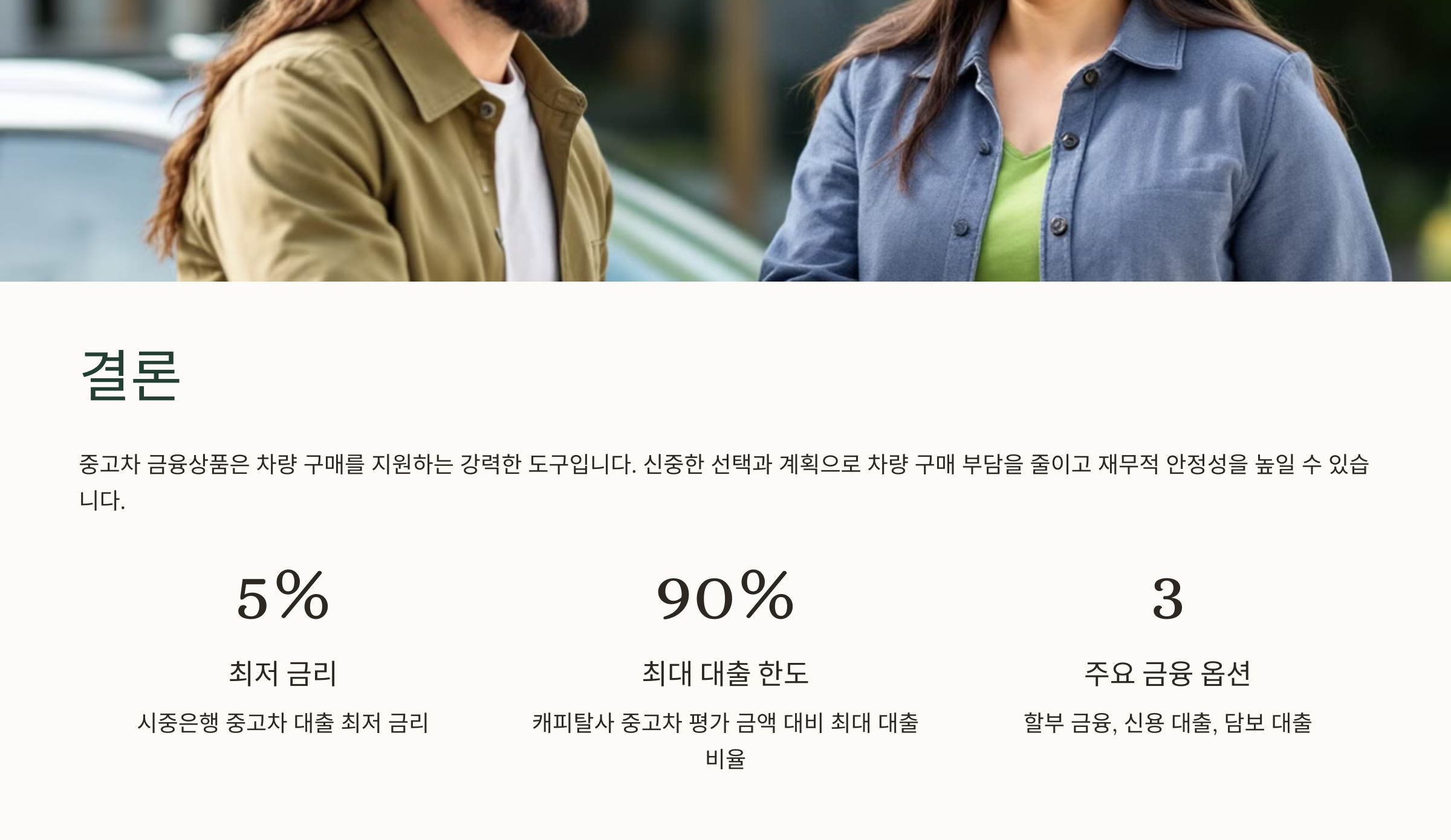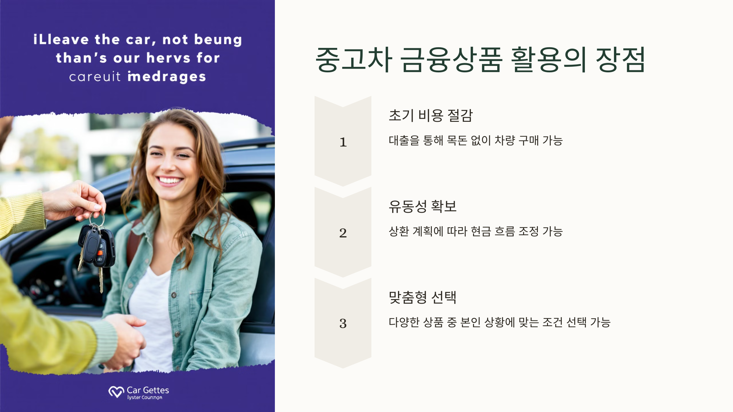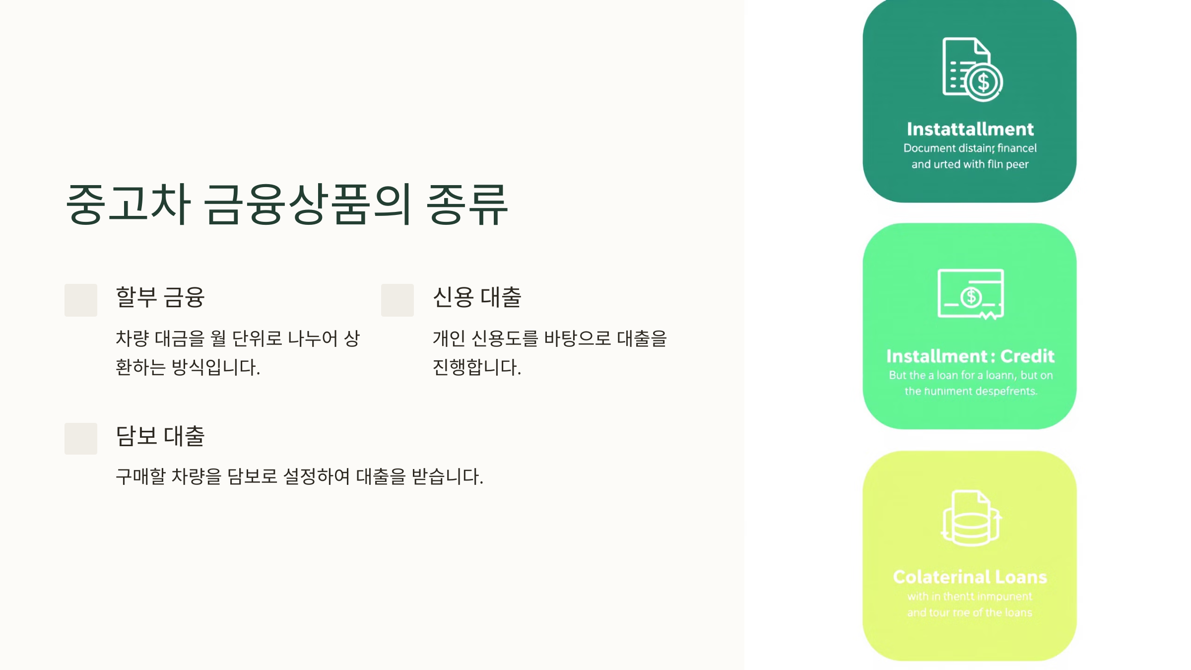 중고차 금융상품은 구매 방식, 대출 조건, 상환 계획에 따라 다릅니다. 아래에서 주요 상품과 특징을 확인하세요.