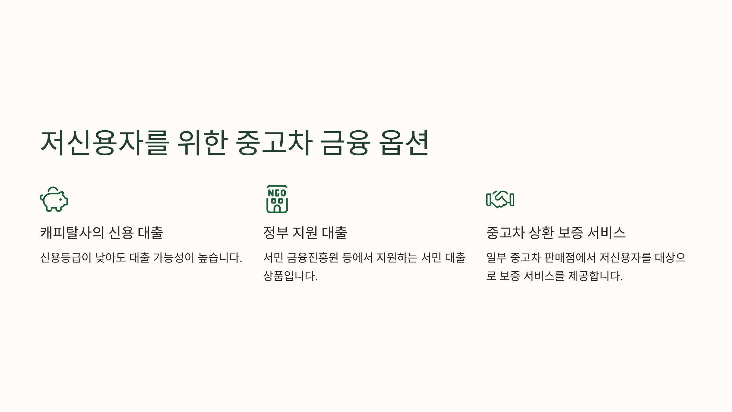- 일부 중고차 판매점에서 저신용자를 대상으로 보증 서비스를 제공하기도 합니다. 추가적인 보증 비용이 발생할 수 있지만, 대출 승인을 받을 가능성을 높일 수 있습니다.