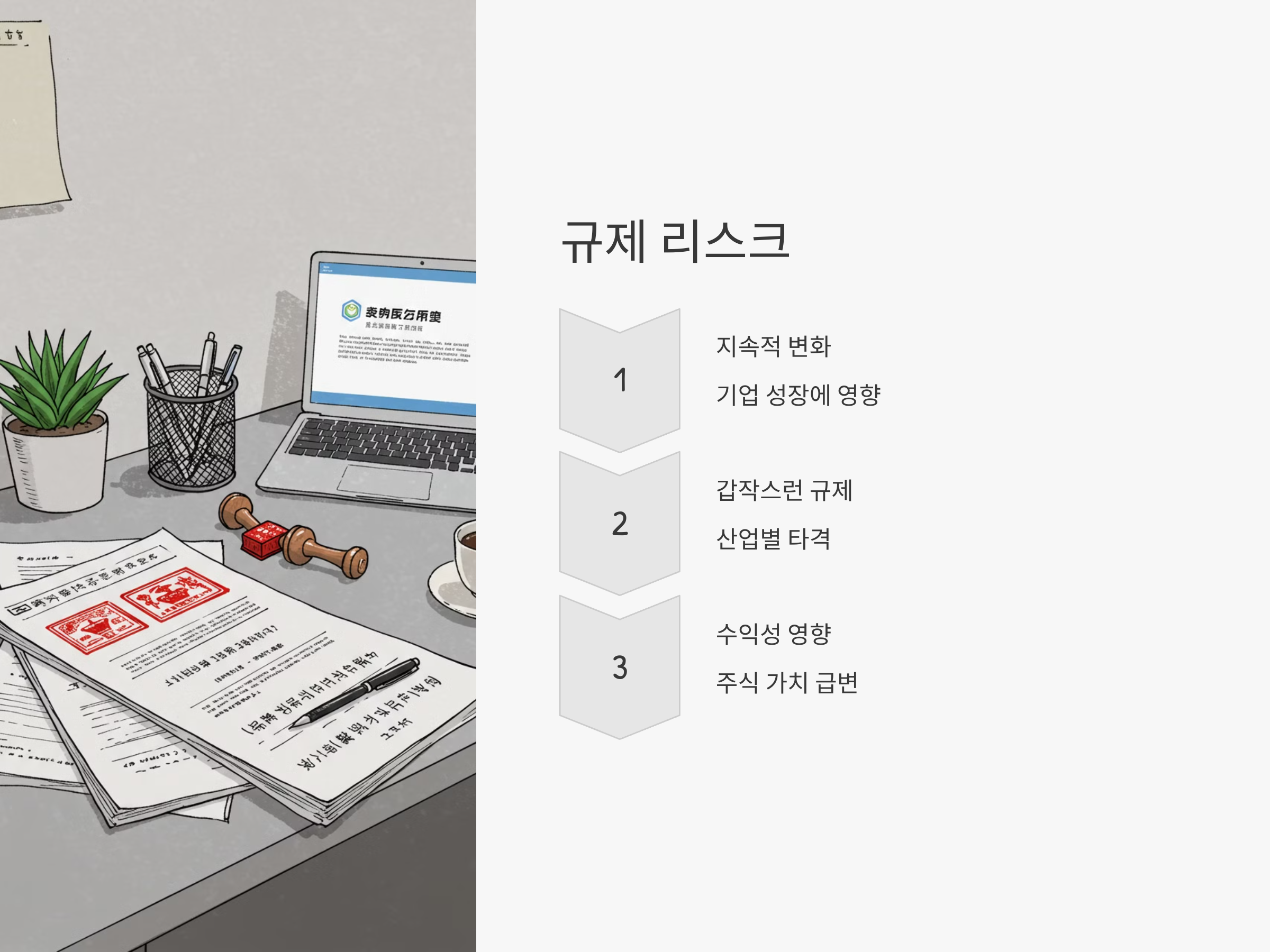 중국의 규제 환경은 계속해서 변화하고 있으며, 이는 기업의 성장 가능성에 큰 영향을 미칠 수 있습니다. 중국 정부는 시장의 효율성을 높이기 위해 다양한 규제 조치를 시행하고 있으며, 이로 인해 일부 산업과 기업들은 갑작스러운 규제 변화를 겪을 수 있습니다. 예를 들어, 중국 정부는 2021년 반독점 규제를 강화하며 여러 대형 테크 기업들에게 큰 타격을 주었습니다.