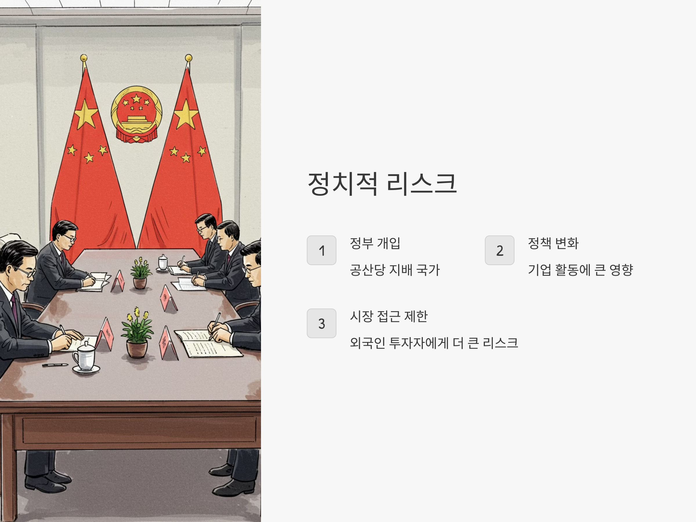 중국은 공산당이 지배하는 국가로, 정부의 정책이 기업 활동에 큰 영향을 미칠 수 있습니다. 정부는 경제를 조정하고, 기업 활동을 직접적으로 개입할 수 있기 때문에 정치적 리스크는 매우 중요합니다. 예를 들어, 중국 정부가 기업의 시장 접근을 제한하거나 특정 산업에 대해 강화된 규제를 도입할 수 있습니다. 특히 외국인 투자자들에게는 이러한 정책 변화가 더욱 큰 리스크가 될 수 있습니다.