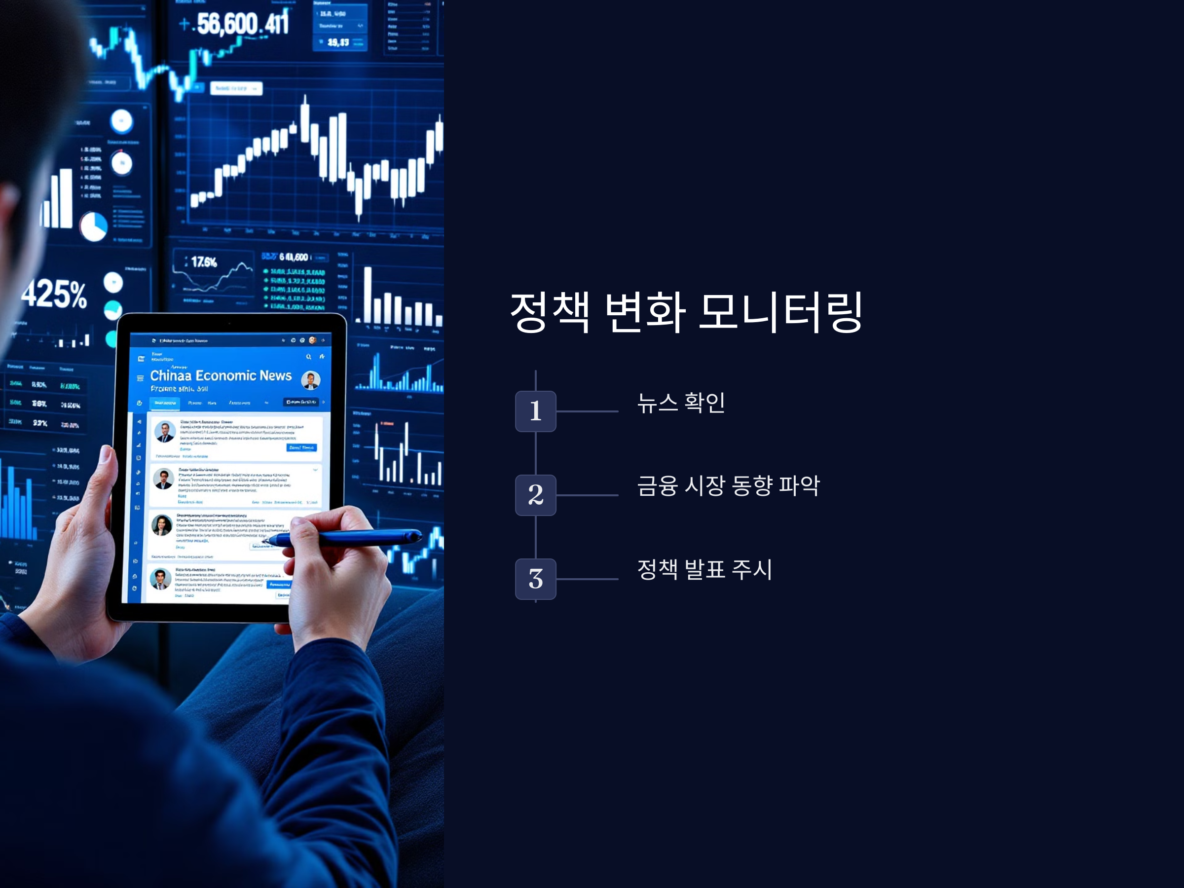 중국 정부의 정책 발표는 중요한 투자 신호를 제공합니다. 주요 정책 변화나 법규 개정을 빠르게 파악할 수 있도록, 중국 경제 관련 뉴스와 금융 시장 동향을 정기적으로 모니터링하는 것이 필요합니다.