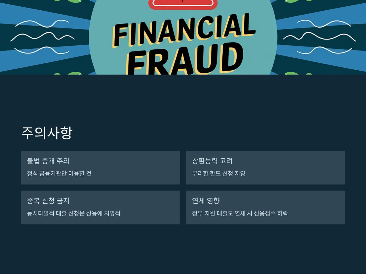 - 불법대출 중개업체에 속지 말 것 (정식 금융기관만 이용)
