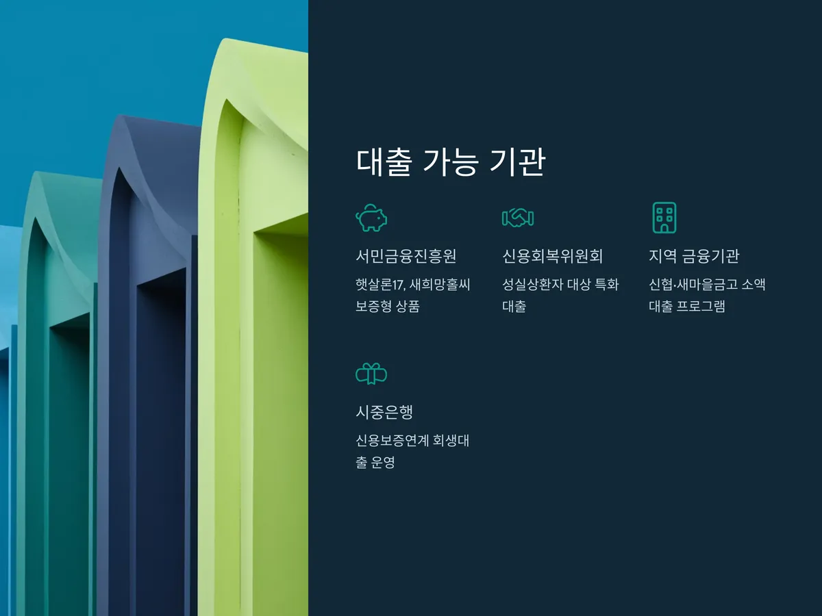 - 일부 시중은행: 신용보증연계 회생대출 운영 중 (국민, 농협 등)