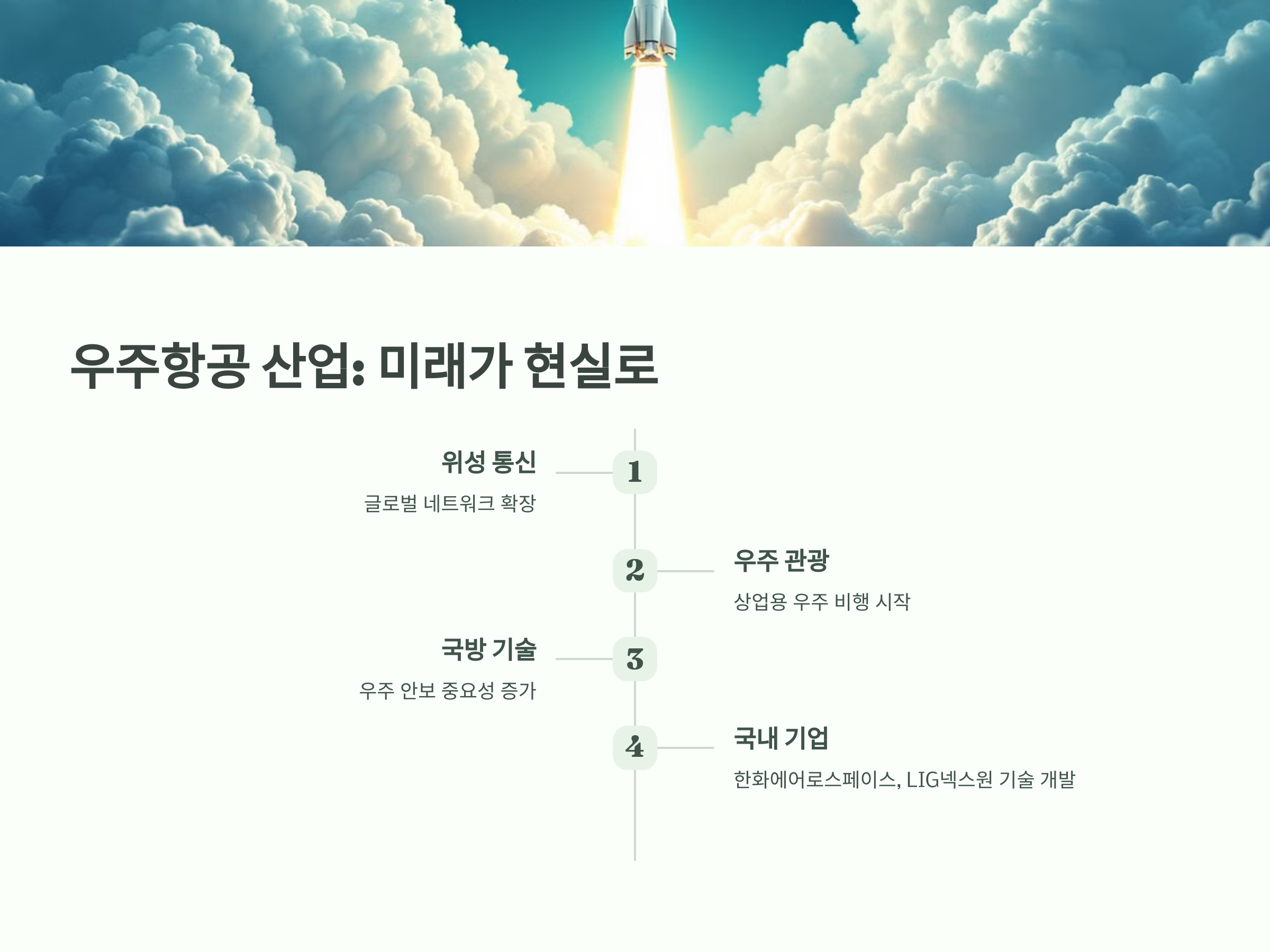 우주항공 산업은 위성 통신, 우주 관광, 국방 기술 강화 등 다양한 분야에서 급격히 발전하고 있습니다. 미국 스페이스X, 블루오리진을 중심으로 상업용 우주 산업이 활성화되고 있으며, 국내에서도 한화에어로스페이스, LIG넥스원 등이 국방 우주 기술 개발에 힘쓰고 있습니다. 2025년부터 본격적인 민간 우주 경쟁이 시작될 것으로 보이며, 투자 기회가 더욱 커질 전망입니다.