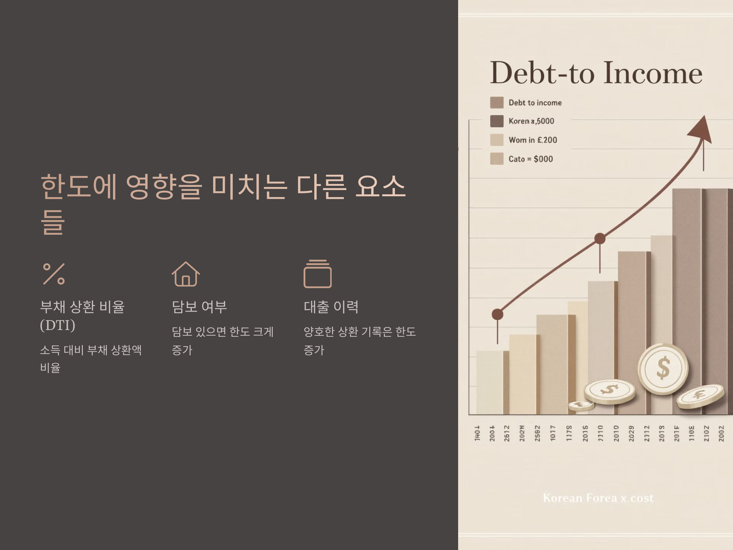 - 상환능력: 대출 상환 능력도 중요합니다. 소득 대비 월 상환액이 너무 많으면 대출 한도가 낮게 책정될 수 있습니다.