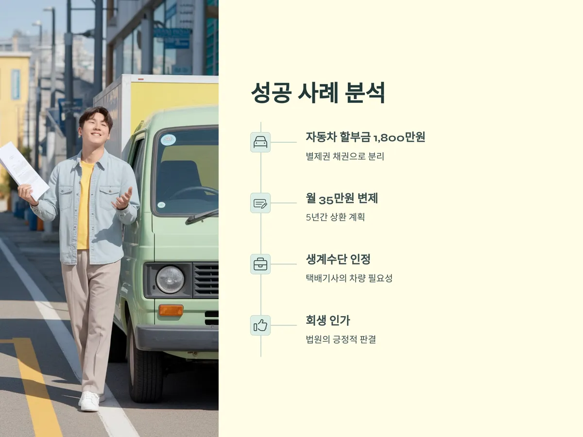 최근 대전지방법원에서는 자동차 할부금 1,800만 원이 별제권 채권으로 분리된 한 사례에서, 채무자가 월 35만 원씩 5년간 변제하는 조건으로 회생인가를 받았습니다. 해당 채무자는 택배기사로 일하고 있었으며, 차량이 생계수단이었기 때문에 담보물 유지를 최우선 과제로 삼았습니다. 법원은 채무자의 의지와 계획의 현실성을 높이 평가했고, 별제권자와의 협의 또한 긍정적으로 작용해 회생이 인가되었습니다.