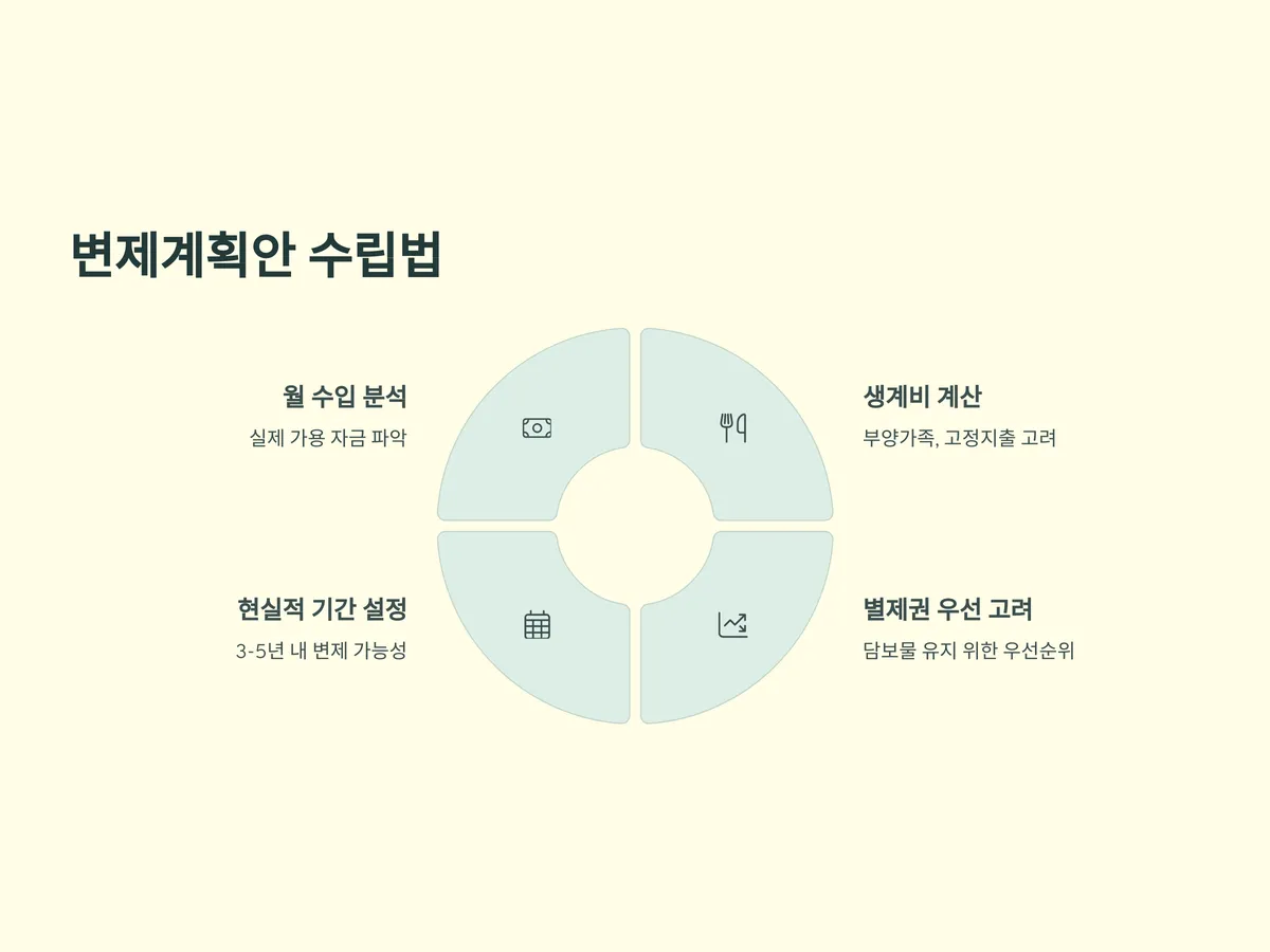 변제계획안은 개인회생의 성패를 가르는 핵심입니다. 현실적으로 상환 가능한 수준에서 계획을 세우되, 별제권자 채권과의 균형을 맞추는 것이 중요합니다. 월 수입 대비 생계비, 부양가족 수, 고정지출 등을 고려하여 남는 금액을 기반으로 작성해야 하며, 법원에서도 이를 기준으로 인가 여부를 결정하게 됩니다.