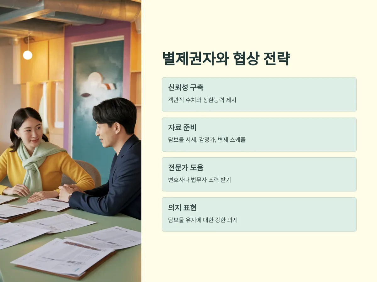 또한, 협상 과정에서는 담보물의 시세, 감정가, 변제 스케줄 등을 구체적으로 제시해야 하며, 필요하다면 변호사나 법무사의 도움을 받는 것이 좋습니다. 협상이 잘 이루어지면 채무자는 담보물을 지키면서도 장기적인 금융 건전성을 확보할 수 있는 기회를 얻게 됩니다.
