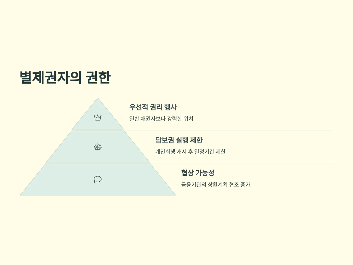 별제권자는 다른 일반 채권자보다 우선적으로 권리를 행사할 수 있는 매우 강력한 위치에 있습니다. 예컨대, 담보물이 제공된 경우 별제권자는 채무자의 회생 여부와 무관하게 담보권을 실행하여 채권을 회수할 수 있습니다. 그러나 이는 일정 조건 하에서만 가능합니다. 개인회생 절차가 개시되면 일정 기간 동안 담보권의 실행이 제한되며, 그 사이 채무자와 별제권자 간의 협상이 중요해집니다.