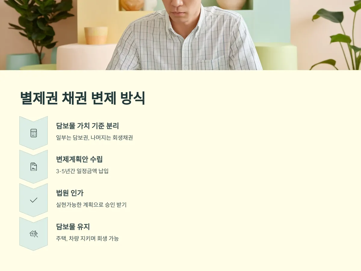 특히 별제권자 채권의 경우 우선순위가 있기 때문에 다른 회생채권보다 먼저 고려되어야 하며, 이를 변제하지 못할 경우 담보물을 잃을 수 있습니다. 따라서 이 부분에 대한 계획은 전문가의 도움을 받는 것을 권장합니다.