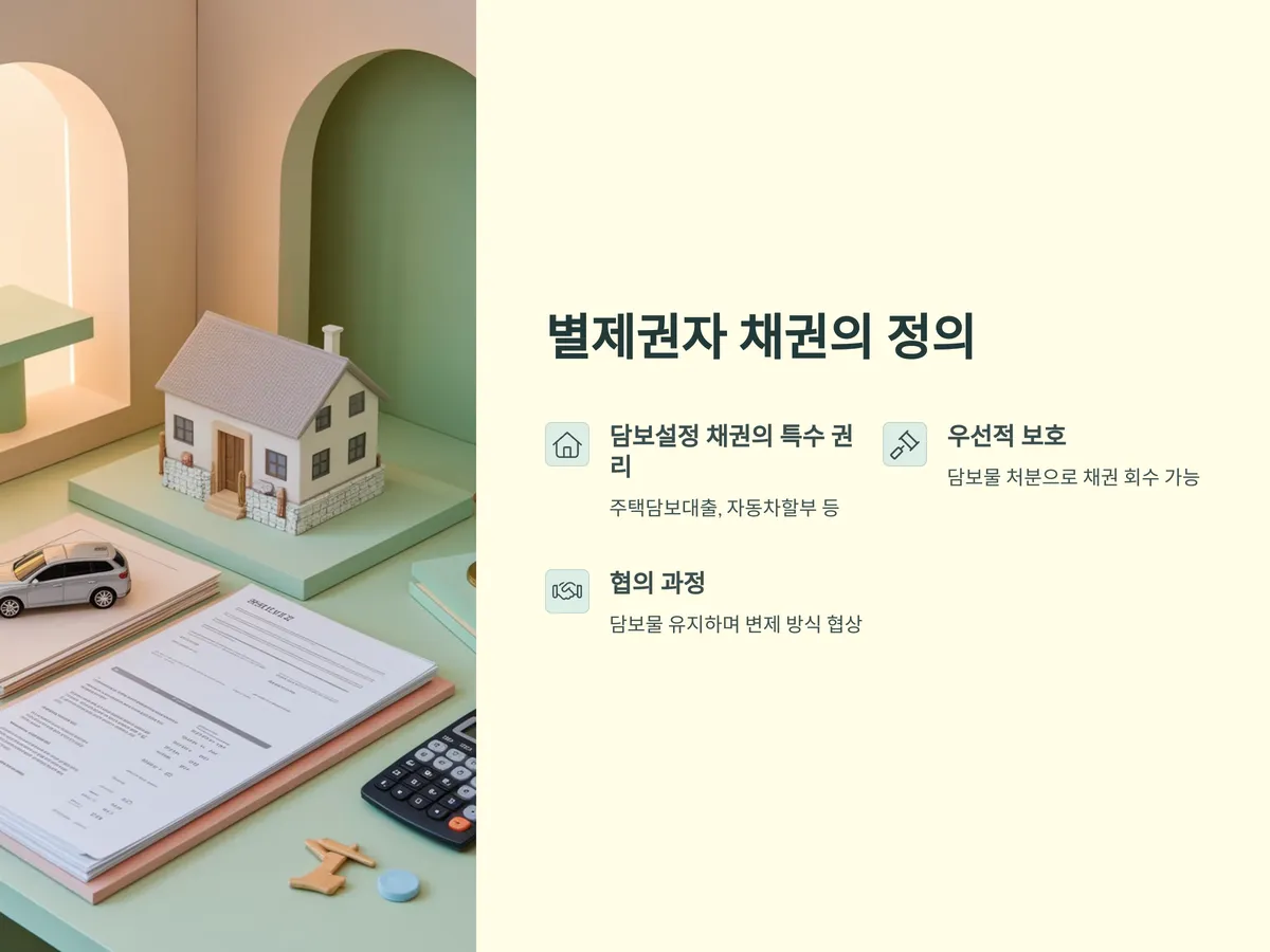 개인회생 절차에서는 모든 채무가 동일하게 처리되지 않습니다. 일반적인 무담보 채권은 변제계획안에 따라 조정되지만, 담보가 설정된 채권은 '별제권'이라는 특수한 권리를 갖습니다. 별제권자는 개인회생이 개시되더라도 담보물을 처분하여 자신의 채권을 회수할 수 있으며, 이는 민사집행법과 채권자 평등의 원칙에도 불구하고 우선적으로 보호됩니다. 예를 들어 주택담보대출을 가진 사람이 개인회생을 신청하면, 해당 금융기관은 집을 경매에 부칠 수 있는 별제권을 행사할 수 있는 것이죠.
