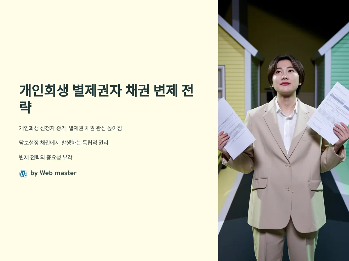 2025년 기준, 국내에서 개인회생을 신청하는 사람들의 수는 꾸준히 증가하고 있으며, 특히 별제권 채권에 대한 관심이 높아지고 있습니다. 별제권은 개인회생 절차 안에서도 독립적으로 행사될 수 있는 권리로, 대부분 주택담보대출, 자동차할부 등 담보가 설정된 채권에서 발생합니다. 최근 금융감독원과 법원은 별제권자와 회생채권자의 권리 균형을 조정하기 위해 관련 지침과 판례를 강화하고 있는데, 이에 따라 변제 전략의 중요성도 함께 부각되고 있습니다. 이 글에서는 별제권 채권의 정의부터 실질적인 대응 전략까지, 구체적이고 실용적인 정보를 정리했습니다. 복잡한 제도를 쉽게 이해할 수 있도록 도와드릴 뿐 아니라, 직접 신청 시 유용하게 참고할 수 있는 실전 팁까지 제공합니다.